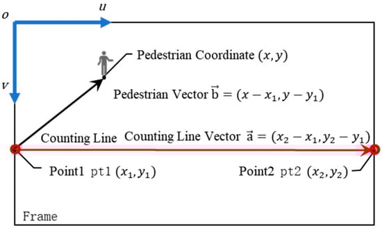 Pedestrian counting using the vector cross product. In this setup, the pedestrian’s movement direction is represented by a black vector, while the red vector represents the counting line.