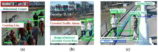 The visualization of pedestrian flow count, density estimations, speed calculation and traffic alarms. (a) depicts a bidirectional counting system with the counting line marked in red. It tracks pedestrians moving in both directions. (b) shows a “crowded” density, leading to a “Crowded Traffic Alarm.” The green box represents the designated region of interest (ROI) for density measurement. (c) shows the “Running Tester” is being monitored by the system with the calculated speed and locomotion modes. The Chinese text in (b) refers to the original timestap from the experimental data and is integral to the raw dataset.