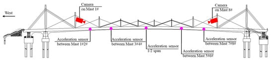 The field test is located on a footbridge across a canal, with a span configuration of (15.9 + 150 + 15.9) meters. The test uses a total of 2 monitoring cameras with one camera and one acceleration sensor installed on each of the main towers on the east and west sides, which costs around 150$ in total. These cameras record video at 1920 × 1080 resolution and 25 fps, with integrated loudspeakers enabling remote verbal intervention during anomalies to maintain deck order, technical details can be seen in Table 2. 10 triaxial accelerometers were pre-installed on the bridge to validate experimental data. The sensors are distributed across 5 measurement locations, with one sensor mounted symmetrically on each side of the bridge at every location. Technical specifications of the accelerometers are provided in Table 3. The sensor layout and camera placement are illustrated in Figure 6.