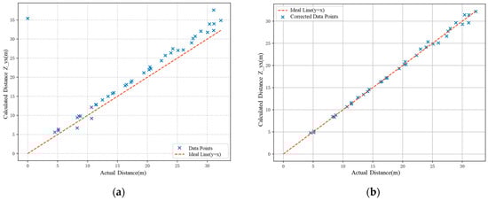 (a) Pedestrian position test with Laser Distance Meter and results with a scatter plot showing data points and the ideal line (represented by the red dashed line). The calculated distances all slightly above the actual distances, demonstrating the linear errors of the distance measurement system. (b) Corrected pedestrian position test results. The corrected data points are closely aligned with the ideal line, suggesting that the distance measurements have been effectively adjusted for accuracy.
