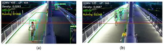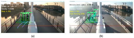 Correspondingly, the system triggered running warnings 13 times. Notably, manual verification revealed three false running alarms triggered not by pedestrians running, but by individuals cycling rapidly through the monitoring area. The misdetection results are shown in Figure 15. This indicates persistent limitations in the running behavior identification system, particularly in distinguishing between running pedestrians and cyclists during rapid movement. From the perspective of abnormal behavior alerting, both running and cycling constitute elevated-risk activities. Notably, since cycling is prohibited on this pedestrian bridge, such instances should be retained as valid warning events within the alert system. However, cycling occurrences, especially frequent during evening peak hours, warrant system alerts to prompt managerial attention.