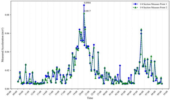 As can be seen in Table 10, the maximum acceleration value occurs at the 1/4 section, with a peak value of 0.0952 m/s2. The location of the peak acceleration aligns with the expected outcome, and the overall structural response trend is within a reasonable range. The relative errors between the theoretical and measured data are 17.48% for the first set (0.081 m/s2) and 5.56% for the second set (0.090 m/s2), but still under the comfort limit of 0.15 m/s2 for footbridges based on EN03.