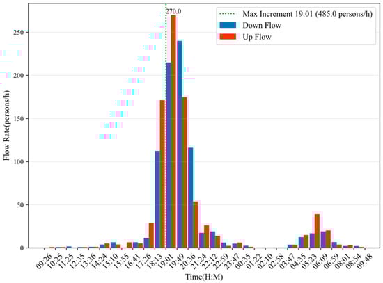 The period from 7:00 p.m. to 7:50 p.m., when the pedestrian flow reached its maximum peak, is selected as a representative value for system accuracy verification. A comparison between manual counting and system counting is conducted to verify the system’s accuracy in estimating pedestrian flow. The comparison is shown in Table 9.