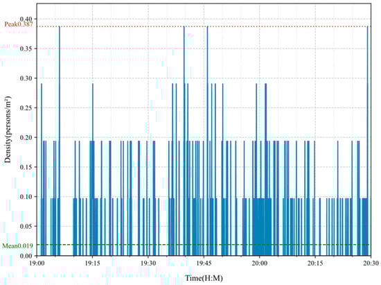 The probability density graph of pedestrian speeds for all pedestrians passing during this period is shown in Figure 14. Excluding the low-speed zone close to 0 m/s, the pedestrian speeds follow a concentrated and regular normal distribution. Specifically, for pedestrians whose behavior meets the running identification criteria with an average speed greater than 2.5 m/s, there are 10 instances, accounting for 0.90% of the total pedestrian traffic during this period.