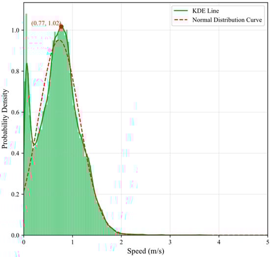 The Probability Density Graph of Pedestrian Speeds. The green shaded area represents the Kernel Density Estimation (KDE) line, indicates that most pedestrians have a speed around 0.77 m/s, with a peak probability density of 1.02 m/s.