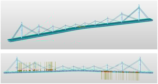 The peak pedestrian density obtained from the measurements is 0.388 persons/m2, with the highest probability pedestrian speed being 0.77 m/s, corresponding to a step frequency of approximately 1.39 Hz. Referencing EN03 German Pedestrian Bridge Design Guidelines, this is converted into pedestrian load and input into the Midas finite element model for structural dynamic analysis using the Lanczos method. The finite element model and vertical load application are shown in Figure 16.