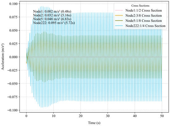 Under the vertical pedestrian load on the bridge, the main analysis focuses on the first-order antisymmetric vertical bending mode. After performing finite element analysis, vibration acceleration time history curves are extracted from key sections located at 1/8, 1/4, 3/8, and 1/2 of the full bridge length. The acceleration response results at each interface are shown in Figure 17.