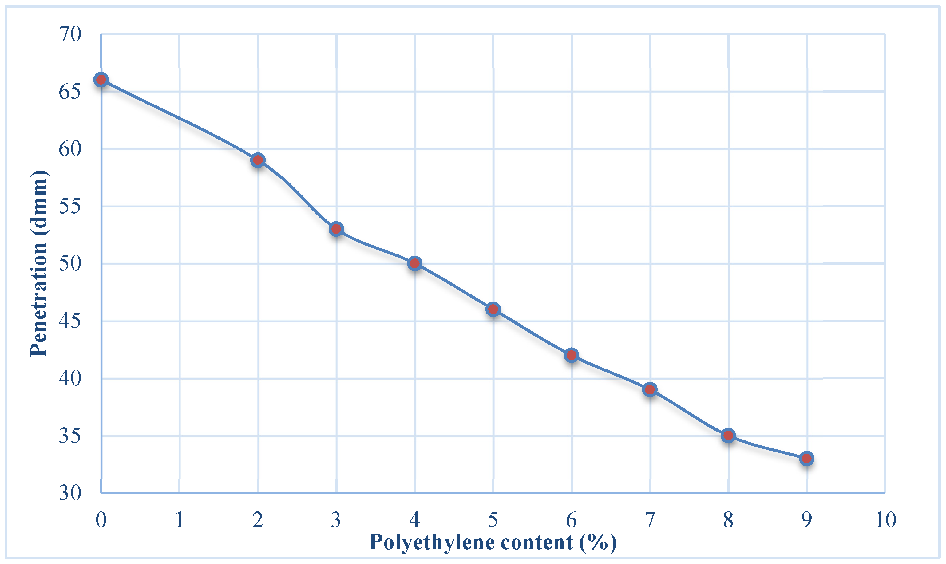 Figure 3). This reduction stems from the interaction between the semi-crystalline HDPE polymer and the bitumen matrix. At the microscale, HDPE chains entangle with asphaltenes and other bitumen components, forming a reinforced, interconnected network that restricts molecular movement, thereby increasing resistance to deformation and lowering penetration.