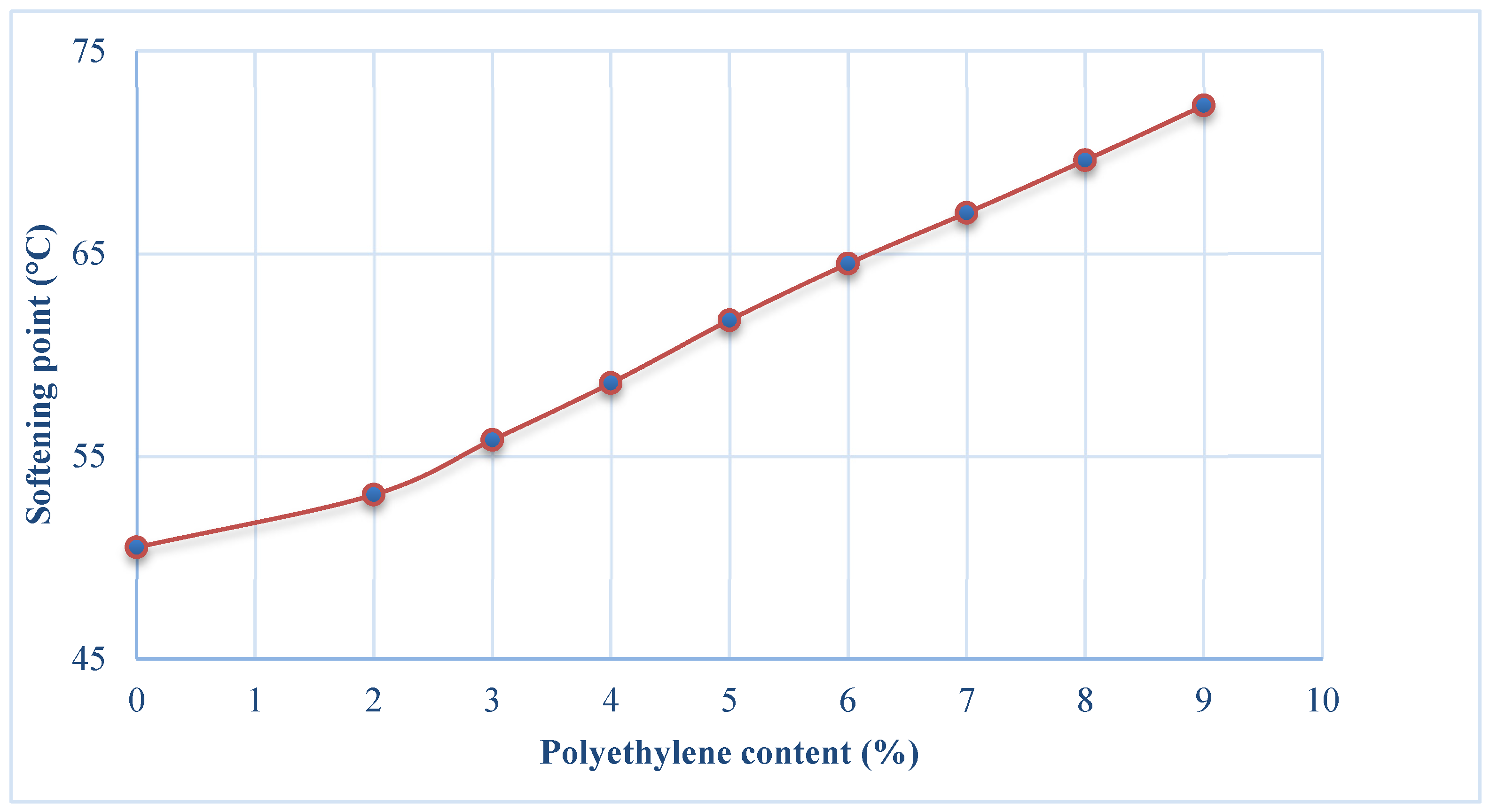 Figure 4, increasing HDPE concentration from 0% to 9% systematically elevates the softening point from 50.5 °C to 72.3 °C. This direct correlation underscores the efficacy of HDPE in enhancing high-temperature performance. The increase is fundamentally linked to the HDPE volume fraction, where higher concentrations impose greater restriction on bitumen mobility, thereby requiring more thermal energy to induce softening. The resulting improvement in rutting resistance under high-temperature service conditions; stemming from elevated softening points; confirms findings by Piromanski et al. [