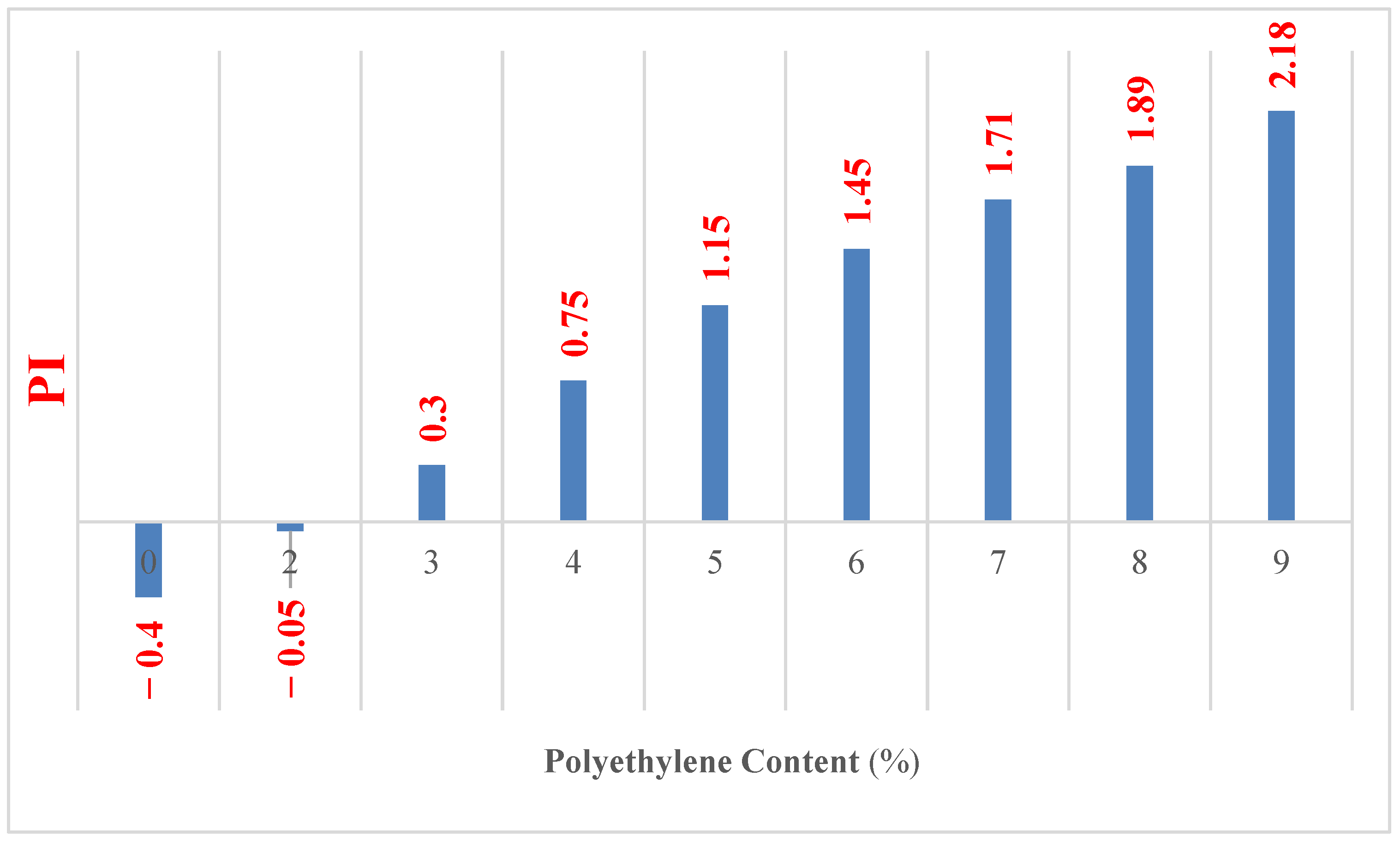 Figure 5). This positive correlation stems from several key mechanisms: (1) Increased Stiffness: HDPE chains intertwine with bitumen asphaltenes, forming a reinforced, rigid network that reduces penetration (25 °C) by enhancing resistance to deformation. (2) Elevated Softening Point: HDPE’s crystalline structure requires more thermal energy to disrupt intermolecular forces, raising the softening point. The consequent reduction in the difference between softening point and 25 °C directly contributes to a higher PI calculation. (3) Enhanced Cohesion: Primarily physical interactions (e.g., van der Waals forces) between HDPE chains and asphaltenes increase the binder’s viscosity and cohesion, improving resistance to permanent deformation. The data explicitly demonstrates this trend: PI rises from −0.4 (0% HDPE, high susceptibility) to +2.18 (9% HDPE, significantly reduced susceptibility). This substantial increase confirms HDPE’s efficacy in enhancing the binder’s thermal stability the higher PI signifies that HDPE-modified binders, as Tahmoorian et al. [