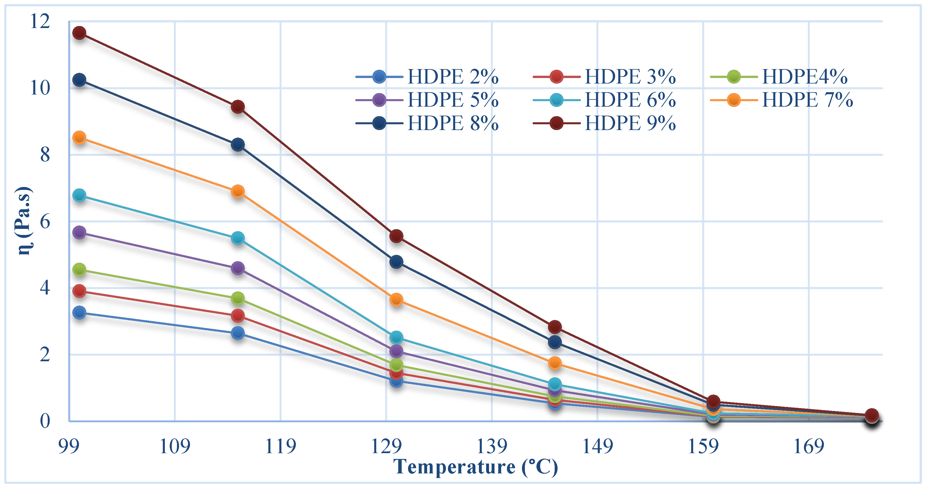 Temperature exerts a critical influence on the viscosity of both neat and HDPE-modified bitumen. As temperature escalates from 100 °C to 175 °C, increased molecular kinetic energy weakens intermolecular cohesive forces, markedly reducing viscosity and enhancing fluidity. The data explicitly demonstrates this significant viscosity decrease with rising temperature across all HDPE percentages (2% to 9%). For instance, viscosity values at 100 °C are substantially higher than those measured at 175 °C for every HDPE concentration level. This pronounced temperature dependence follows the Arrhenius relationship, which models the exponential decrease in viscosity with increasing absolute temperature. The activation energy for viscous flow, derived from the Arrhenius equation slope, quantifies the temperature sensitivity. The formation of HDPE networks at higher concentrations (≥6%) modifies the temperature susceptibility compared to the base bitumen or lower HDPE content blends. Understanding this temperature-viscosity profile, modulated by HDPE content, is essential for predicting binder performance during asphalt mixture production (mixing, compaction temperatures) and in-service resistance to rutting deformation at elevated pavement temperatures.