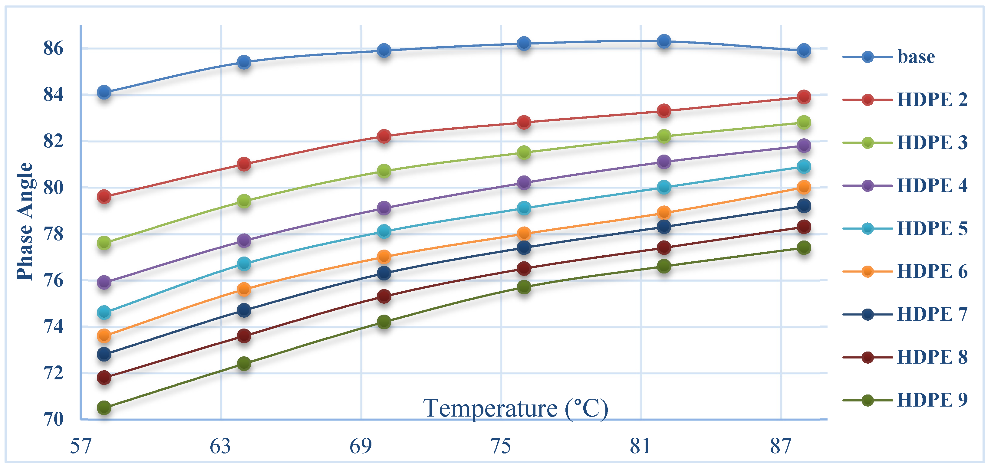 Figure 7, increasing HDPE content leads to a systematic decrease in phase angle (δ). At lower concentrations (e.g., 2–4%), dispersed HDPE chains act as reinforcing elements, restricting bitumen molecular flow, reducing the viscous component, and thereby lowering δ.