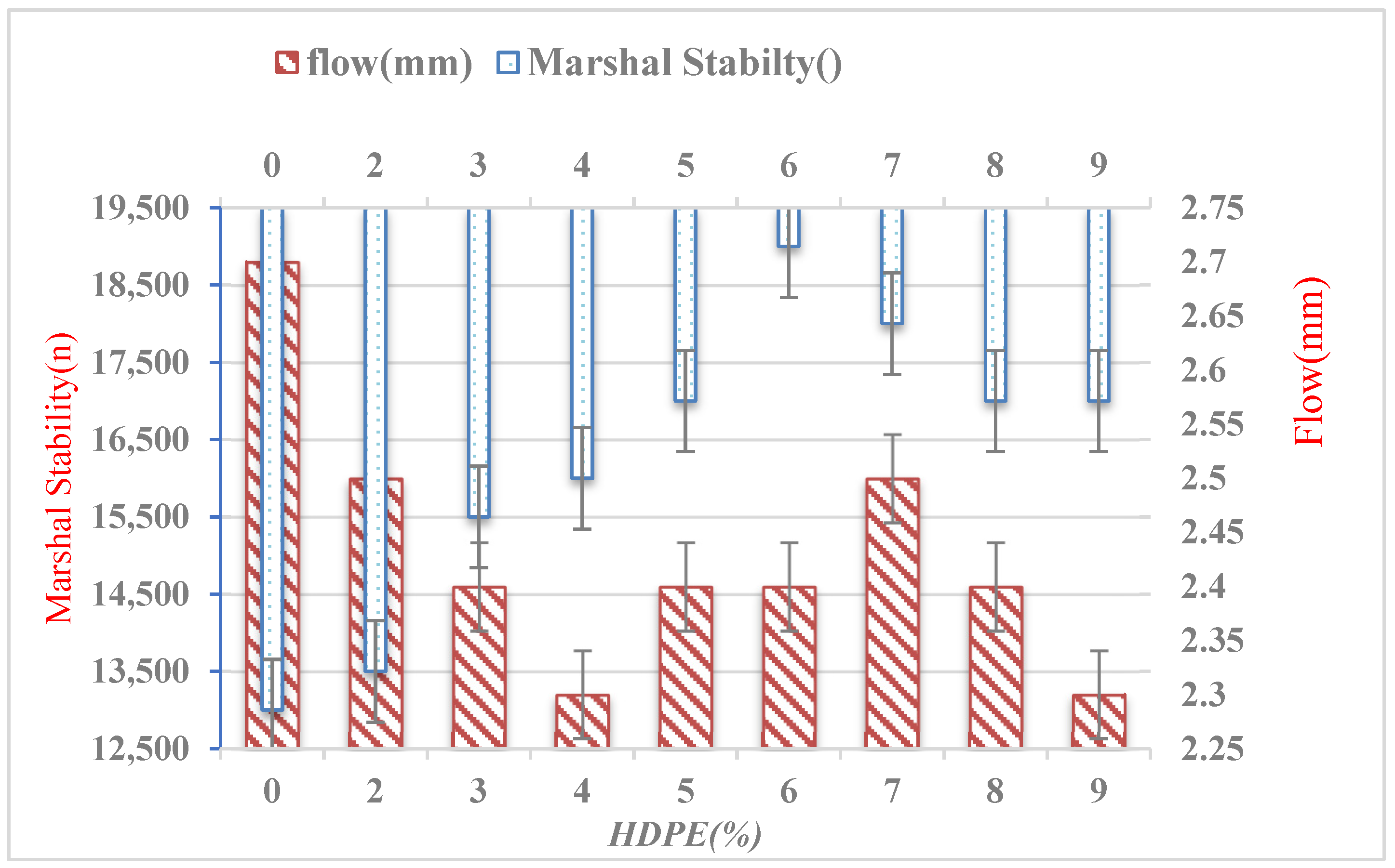 Despite the decrease after the peak, all HDPE-modified mixtures exhibited Marshall Stability values substantially higher than the unmodified control (13,000 N), confirming the overall beneficial effect of HDPE modification within the tested range. The non-monotonic response underscores the paramount importance of identifying the precise optimal HDPE dosage (here, 6%) for a given bitumen source, aggregate type, and mixing/compaction protocol to maximize stability gains; this optimum balances the positive reinforcement and adhesion effects against the negative consequences of poor dispersion, workability issues, and excessive brittleness. The underlying physicochemical processes are predominantly physical, driven by polymer absorption, swelling, network formation, and microstructural changes affecting binder rheology (increased complex modulus G*, reduced phase angle δ) and interfacial properties, rather than deep chemical bonding.