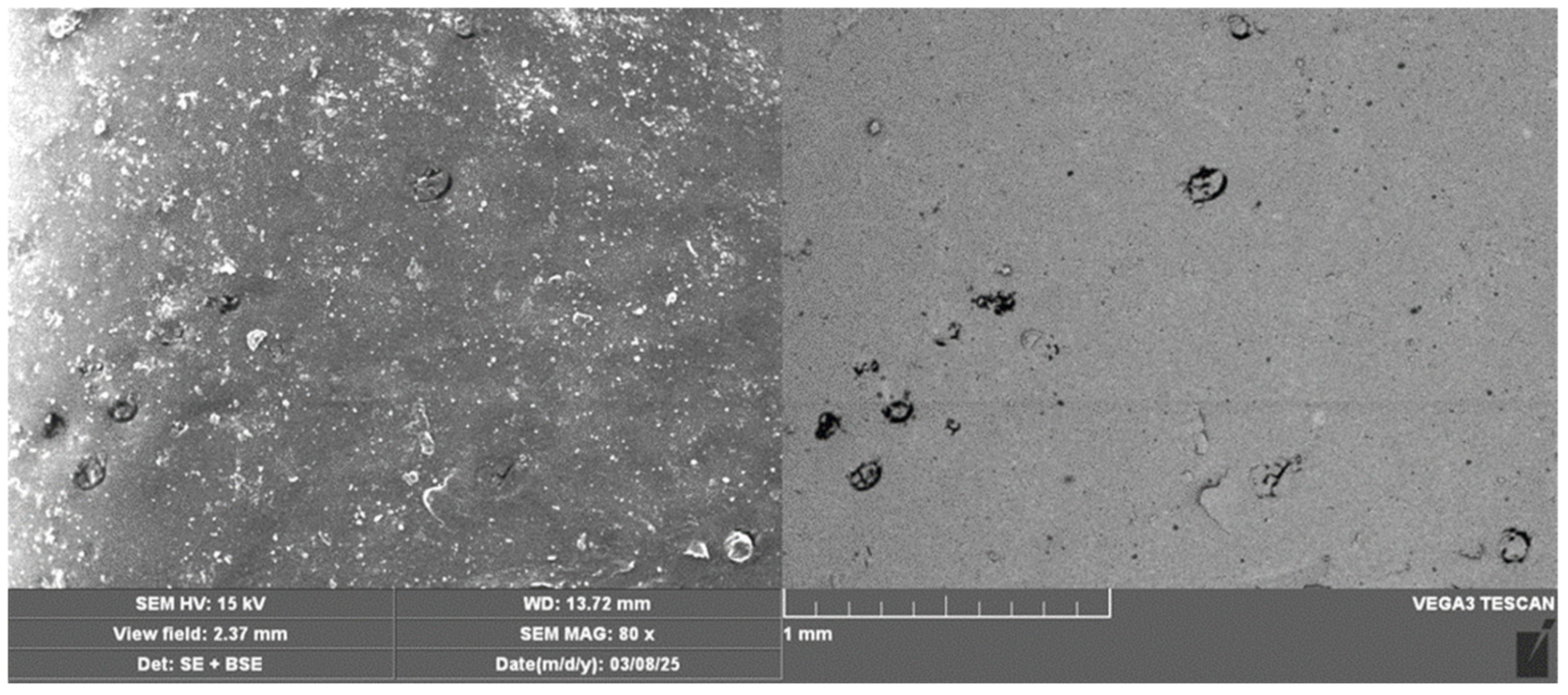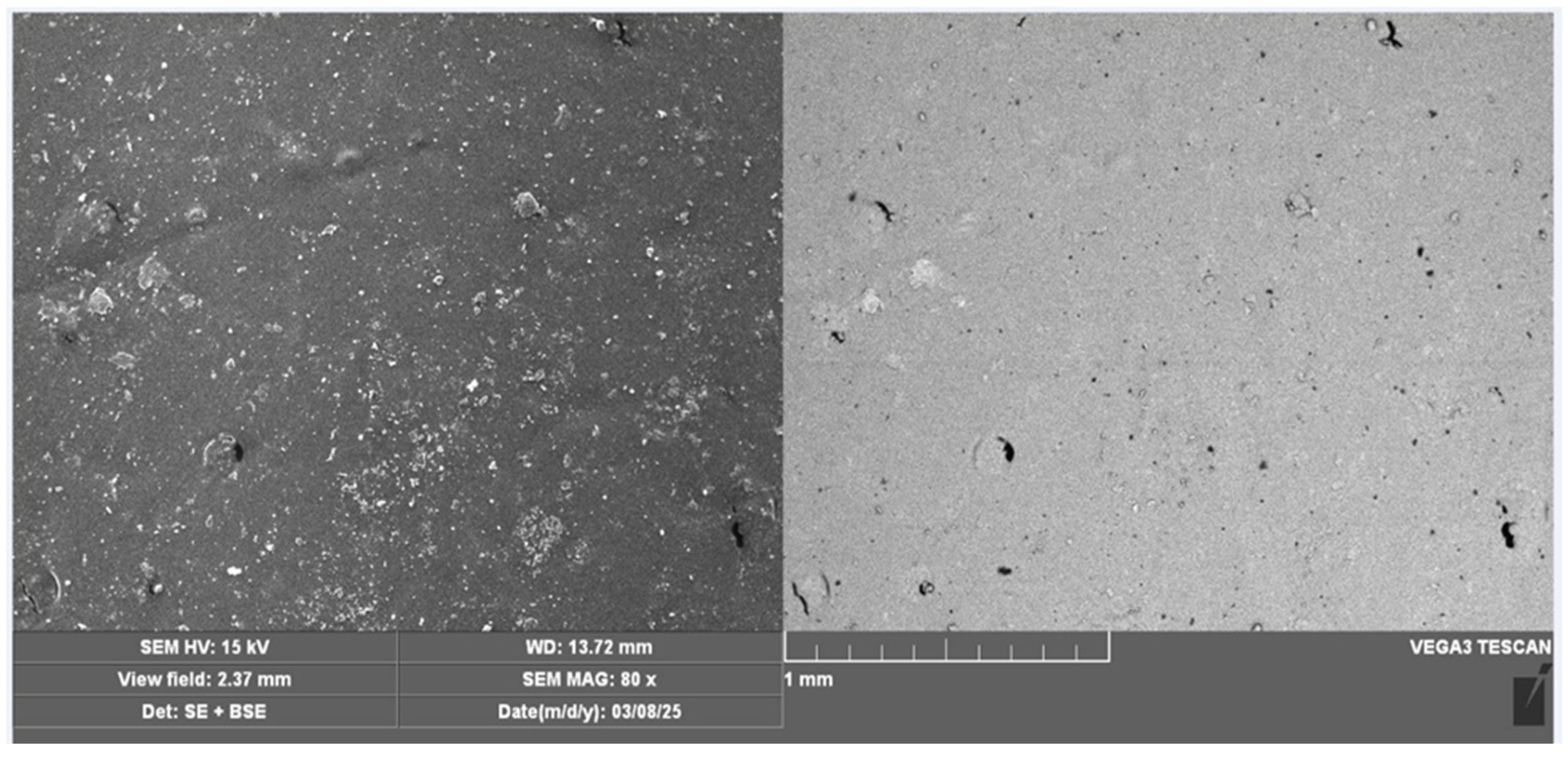 Figure 10, SEM image provides a detailed microstructural analysis of bitumen modified with high-density polyethylene (HDPE) subjected to high-temperature conditions. The right panel offers a higher-contrast view emphasizing the distribution and interaction of HDPE particles within the bituminous matrix, accentuated by distinct round or irregular-shaped inclusions. These particles appear well-dispersed, with some degree of coalescence, which is critical in influencing the rheological and mechanical behavior of the composite at elevated temperatures. The microstructural features suggest strong physical integration of HDPE within bitumen, as Da Silva et al. [