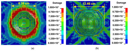Figure 7 presents the simulated damage patterns on the top and bottom faces, where the experimental results could be found in [49]. In the tests, conical craters formed on both surfaces, with measured diameters of approximately 8 cm on the blast face and 12 cm on the rear face. The numerical model reproduces these features, predicting crater diameters of 8.38 cm and 12.46 cm, corresponding to relative errors of 4.75% and 3.83%, respectively. The simulation also captures the extent of spalling, scabbing and the absence of full perforation. This close agreement in crater size and damage morphology indicates that the combined use of the CLE formulation and the RHT concrete model can reliably represent blast-induced cracking, spalling and scabbing in concrete slabs, and thus forms a sound basis for subsequent simulations of pavement structures subjected to underground gas pipeline explosions.