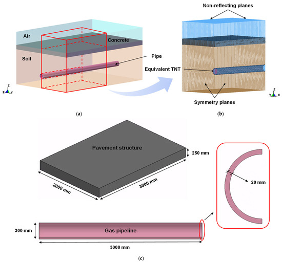 Numerical model of the pipeline–soil–pavement system under gas pipeline explosion: (a) schematic diagram of the model, (b) finite element model, (c) dimensions of the pavement structure and gas pipeline.