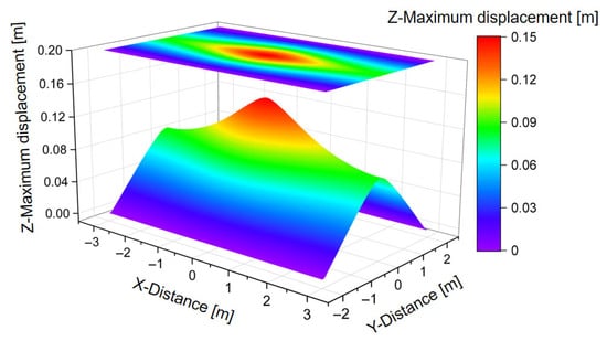To assess the influence of CFRP thickness on the structural response for each scheme, computations are carried out for total CFRP thicknesses of 0.167 mm, 0.668 mm and 1.67 mm. Figure 21 shows the corresponding distributions of Z-maximum displacement along the X and Y directions. For both reinforcement schemes, the introduction of CFRP leads to a pronounced reduction in maximum vertical displacement compared with the unreinforced slab, confirming the beneficial effect of CFRP on blast resistance. As the CFRP thickness increases, the Z-maximum displacement decreases monotonically, reflecting the enhanced flexural stiffness and tensile capacity provided by the composite layers. For all thicknesses considered, Case 2 (top-and-bottom reinforcement) yields smaller displacements than Case 1, and the performance gap between the two schemes widens as the CFRP thickness increases. This trend indicates that simultaneous restraint of tensile strains on both faces of the slab is more effective than strengthening the tension face alone, particularly at higher reinforcement levels.