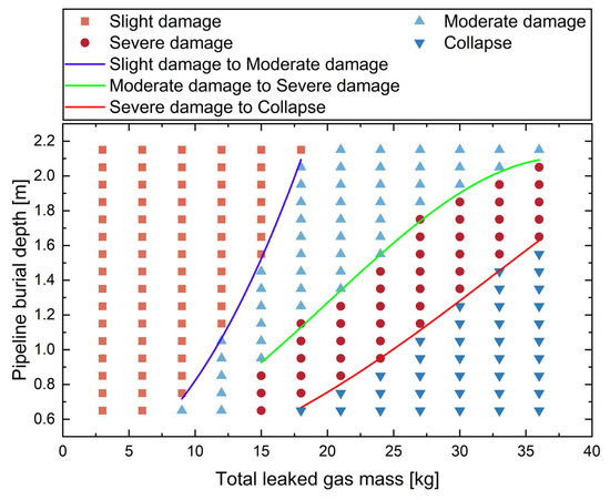 To establish quantitative boundaries between the four damage levels, a comprehensive series of numerical simulations was carried out for total leaked gas masses ranging from 6 to 36 kg and pipeline burial depths (PBD) between 0.65 and 2.15 m. For each case, the maximum pavement deflection was extracted and classified according to Table 2. Figure 20 summarizes the statistical distribution of maximum deflection over the full parameter space, together with fitted critical curves separating adjacent damage levels. The results show that damage severity increases systematically with increasing total leaked gas mass and decreasing burial depth, reflecting the combined effect of higher explosion energy and reduced soil confinement. The critical curves, expressed by the empirical relation in Equation (13), provide clear quantitative demarcations between slight, moderate, severe and collapse states, and thus form a convenient basis for damage prediction and performance-based design of pavement structures above gas pipelines.