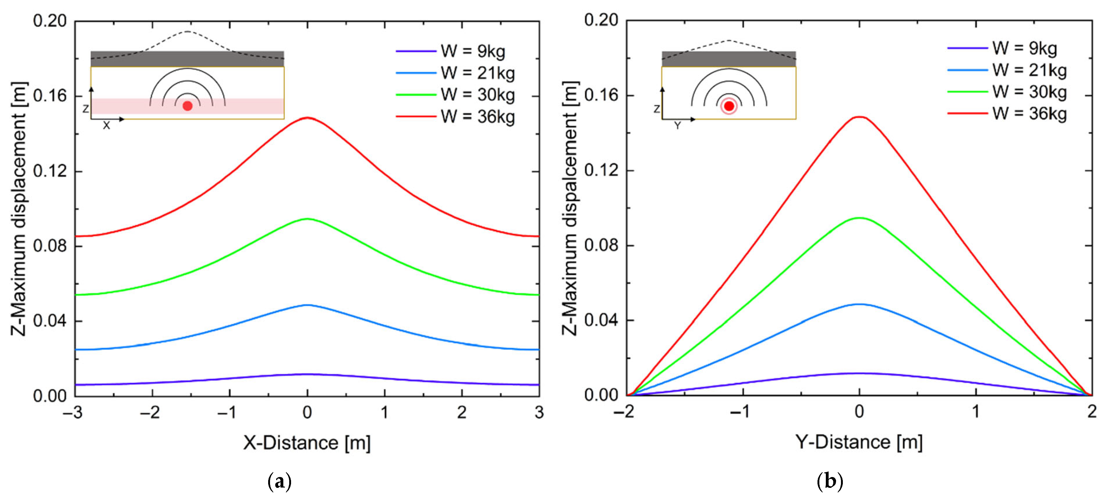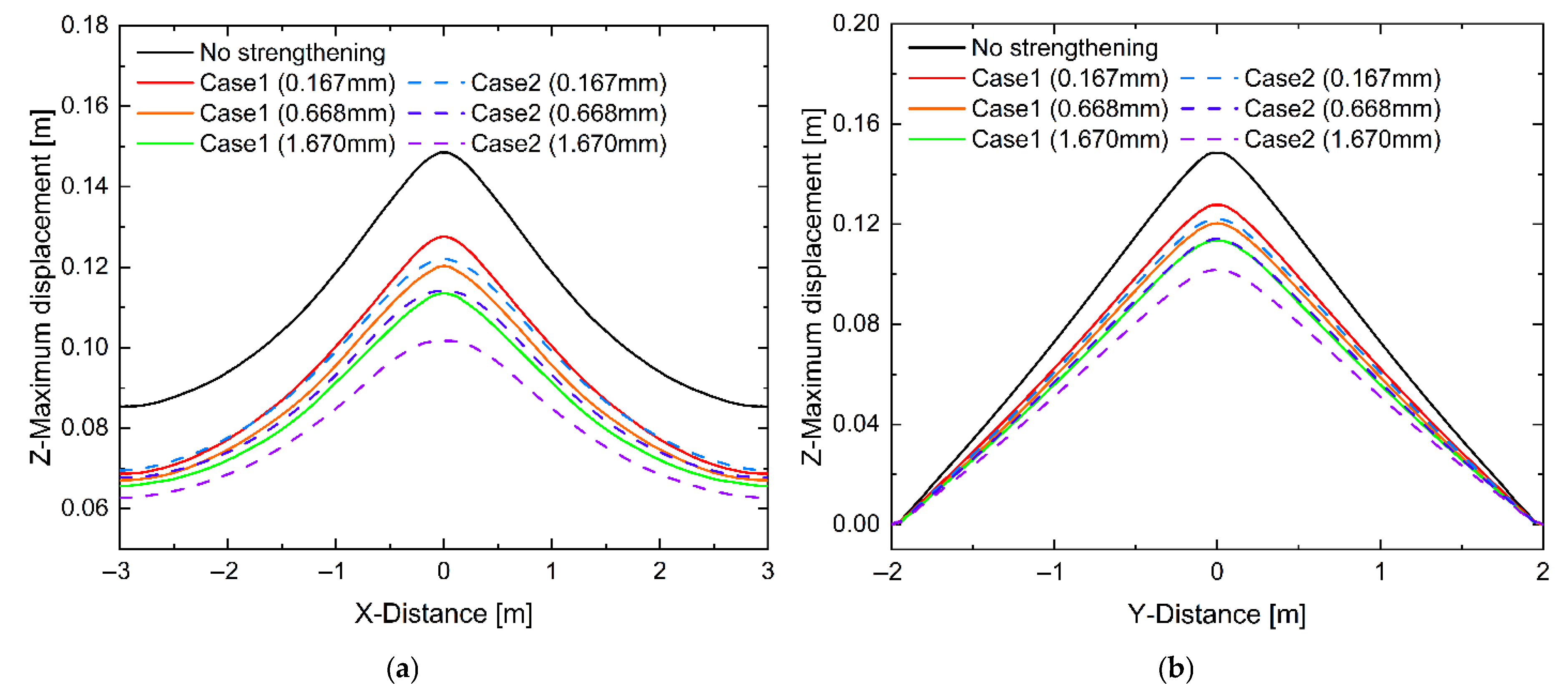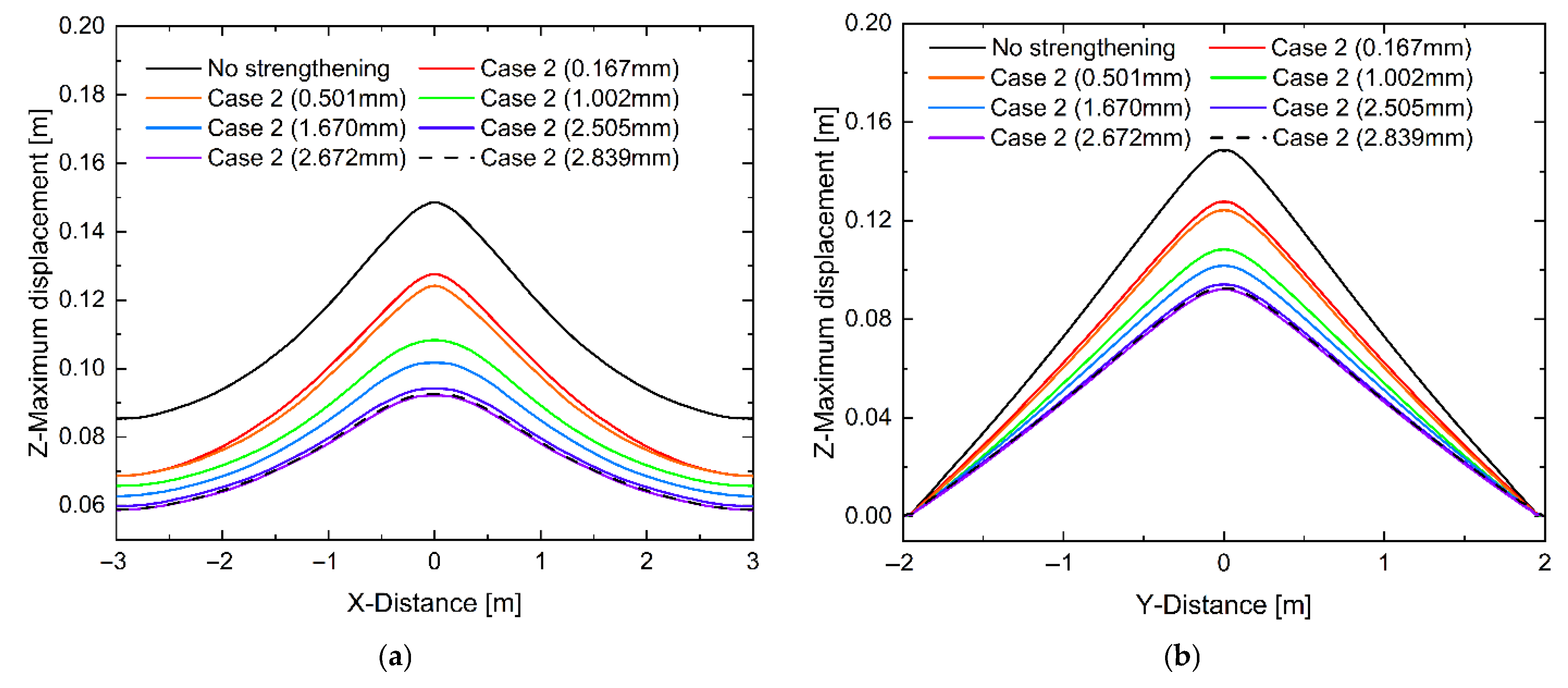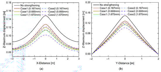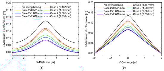 Z-maximum displacement under different CFRP reinforcement thicknesses: (a) variations along X direction, (b) variations along Y direction.