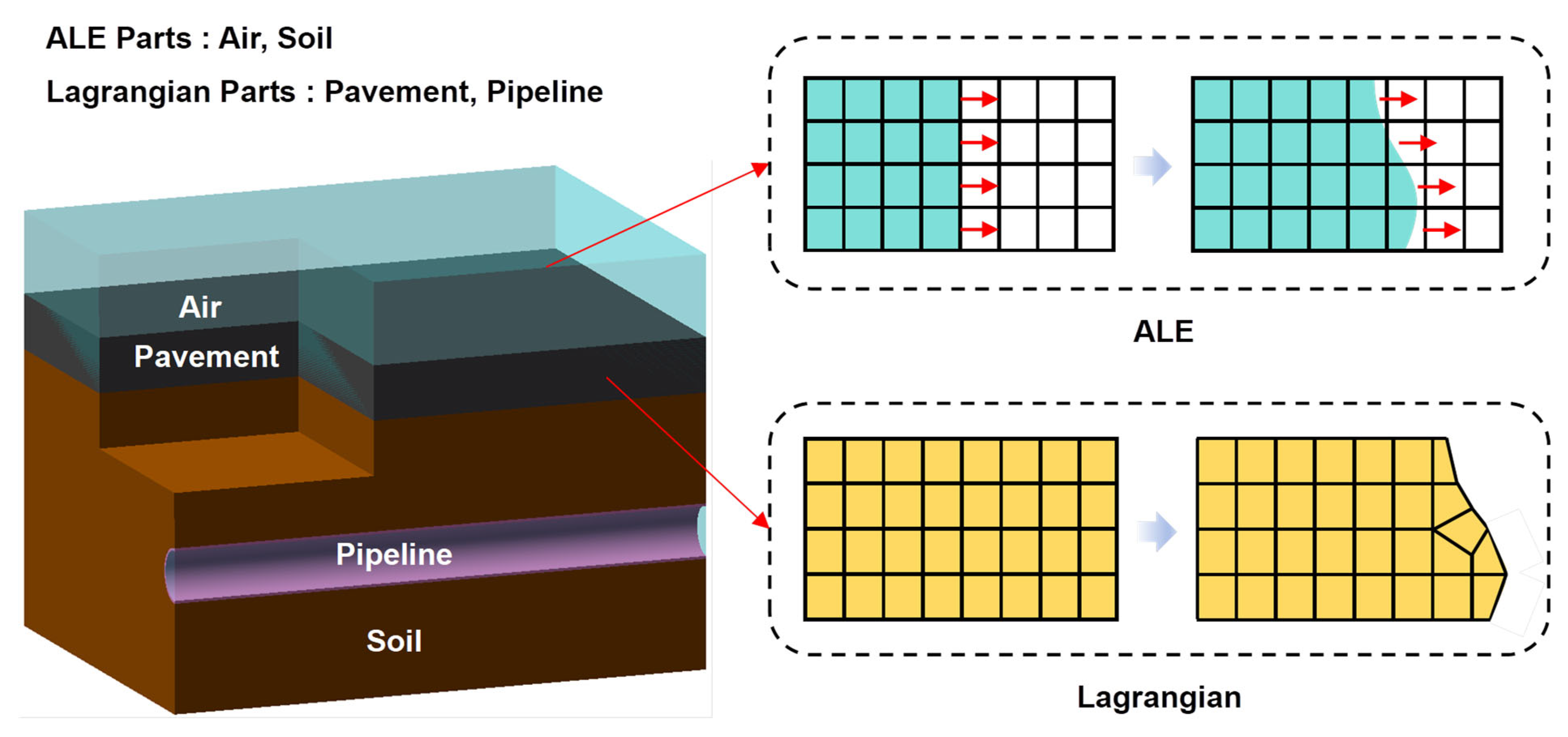 The Lagrangian subdomain extends vertically from the pavement surface to a depth at which the explosion-induced stress waves have essentially attenuated, and laterally to several times the pipe burial depth. This configuration limits artificial reflections from the model boundaries and ensures that the zone of interest around the pipeline and pavement is not contaminated by boundary effects within the time window considered. The pavement structure, backfill, native soil and pipeline are discretized as distinct material regions, allowing differences in stiffness, strength and energy dissipation to be represented explicitly.
