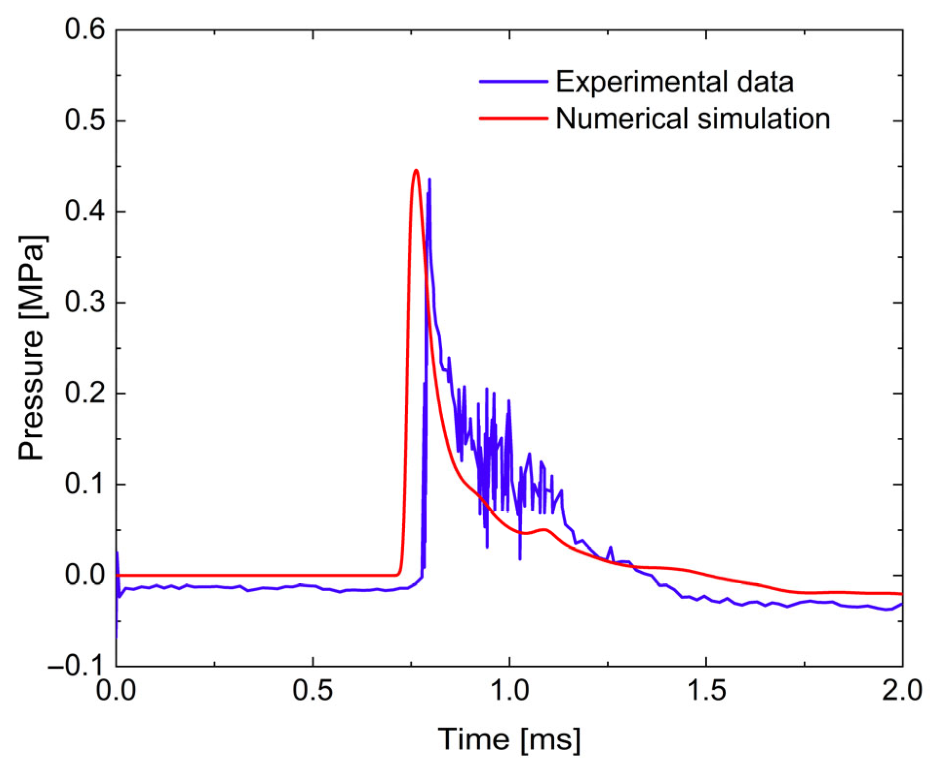 Figure 3 compares the simulated and measured pressure–time histories at the monitoring point. The calculated stress wave arrives at approximately 0.7 ms, followed by a rapid rise to a peak pressure of 0.445 MPa at about 0.76 ms, and then a gradual decay into a negative phase. This evolution reflects the transient confinement provided by the overlying soil, whose wave impedance is much higher than that of air. As the shock front propagates upward, energy dissipation in the soil remains relatively slow, while rarefaction waves that develop behind the front give rise to the subsequent negative phase as the wave enters the air domain. The difference between the numerical and experimental peak pressures is about 0.007 MPa, and the small phase shift in arrival time is negligible for engineering applications, indicating that the main features of blast wave propagation are accurately captured.