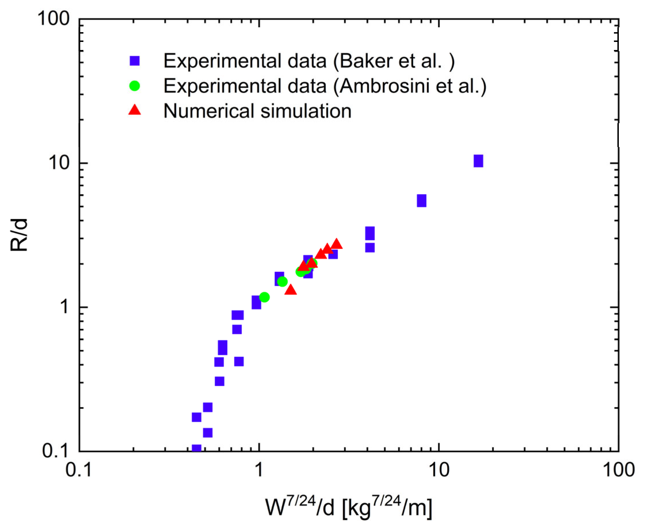 A further validation concerns the formation of craters and subsurface cavities generated by buried spherical charges. Under a buried explosion, soil in the vicinity of the charge is crushed and compacted radially outward, forming a cavity and, at shallow burial depths, an apparent surface crater. The crater size and geometry depend mainly on explosive weight, burial depth and soil resistance. Baker et al. [46] proposed an empirical relation for apparent crater radius in terms of scaled crater radius and scaled charge weight, based on dimensional analysis and a large number of field tests, as expressed by