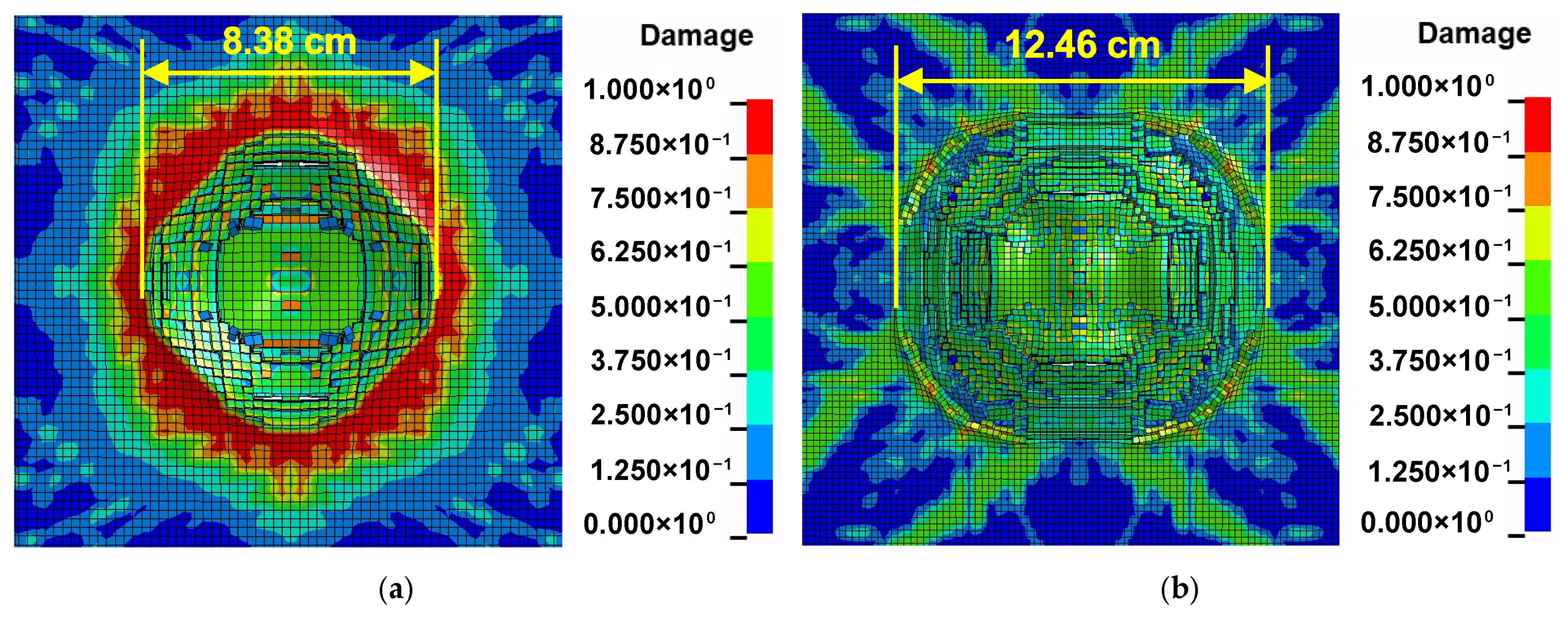 - Xu, K.; Lu, Y. Numerical simulation study of spallation in reinforced concrete plates subjected to blast loading. Comput. Struct. 2006, 84, 431–438. [Google Scholar] [CrossRef]