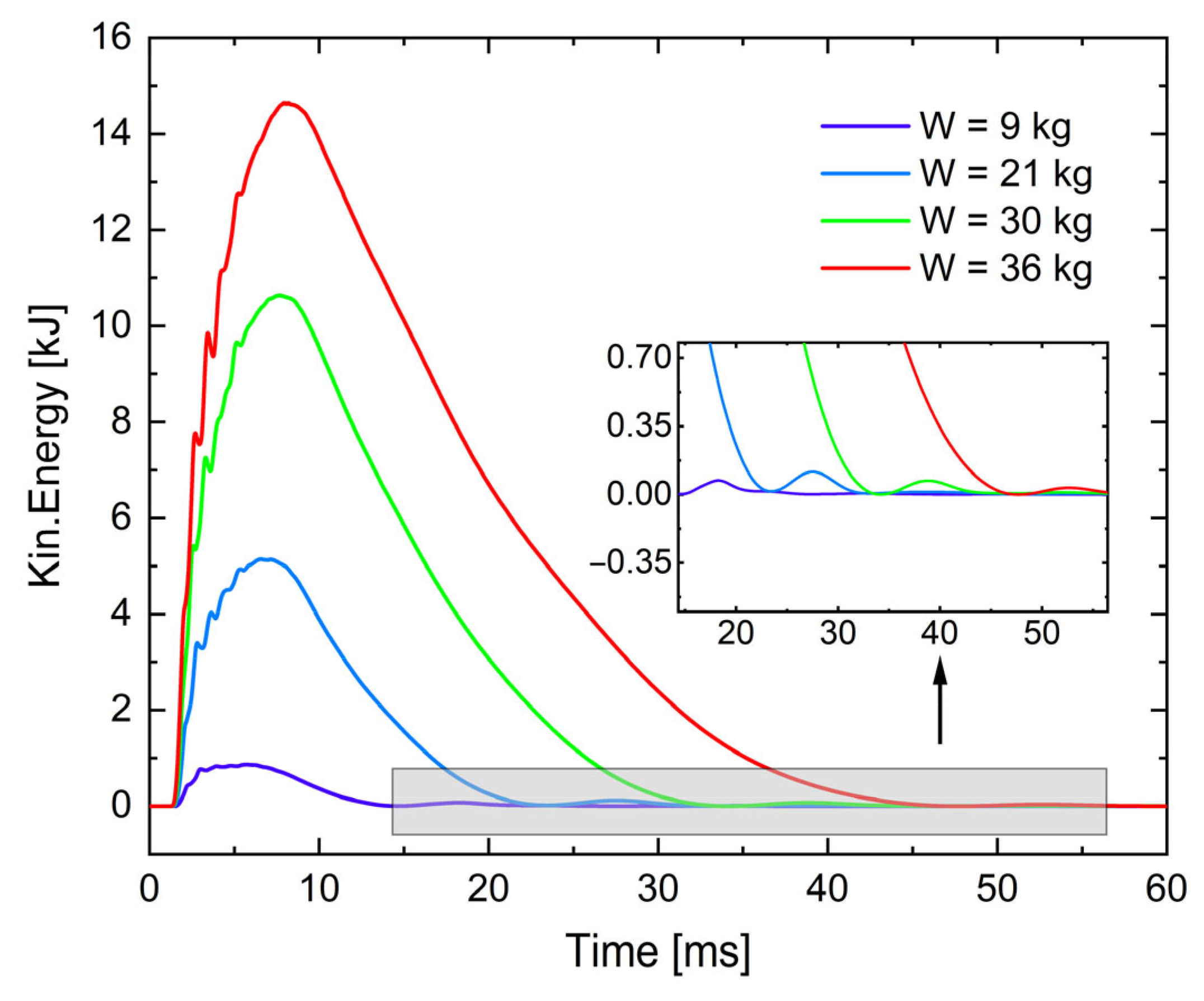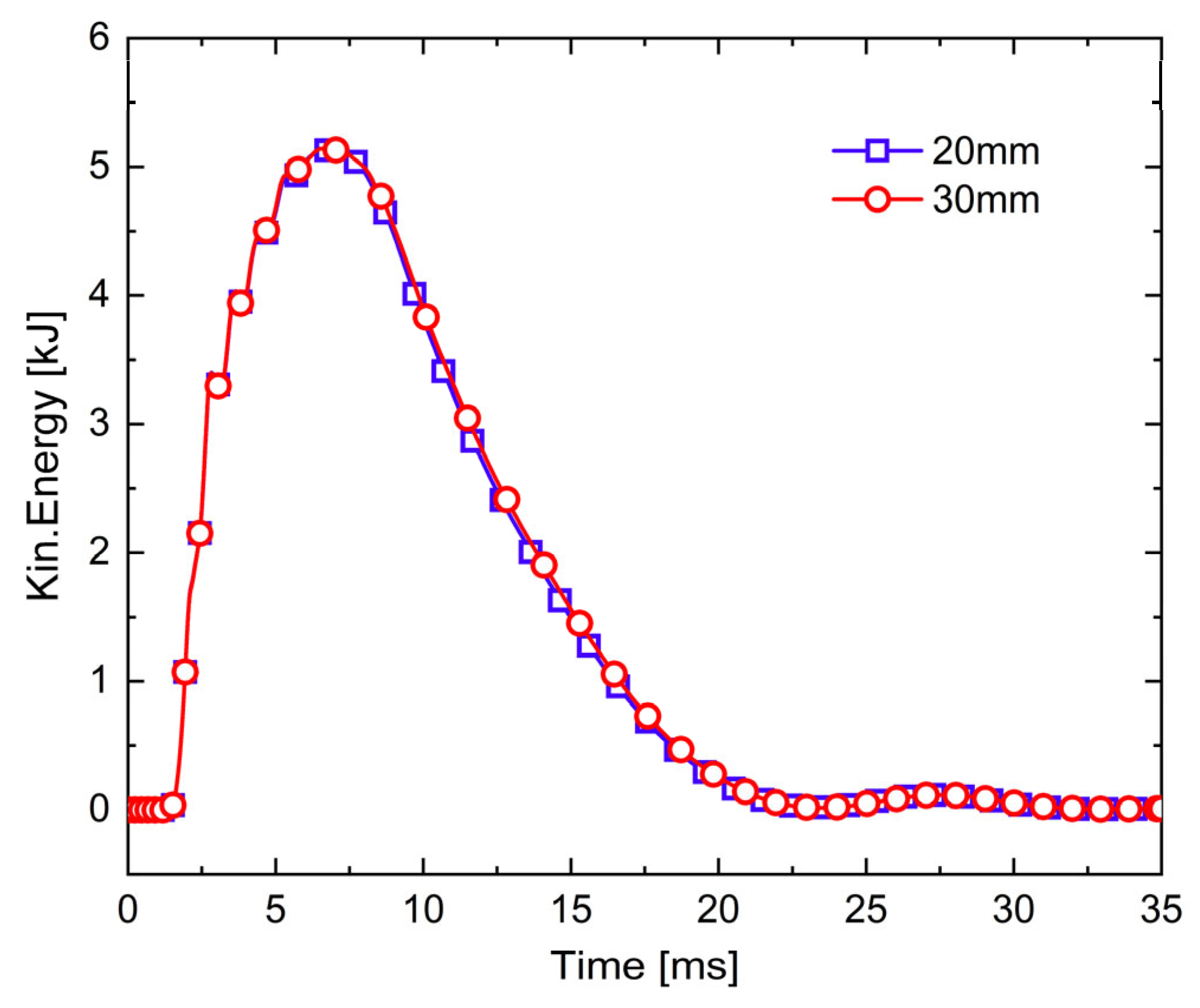 The analysis focuses on the dynamic response of the pavement slab, which is the primary indicator of surface damage and serviceability. Several meshes with different characteristic element sizes in the pavement and adjacent soil are generated, while keeping the overall geometry, material models and boundary conditions unchanged. For each mesh, a representative explosion scenario is simulated and the time history of the total kinetic energy of the pavement slab is extracted. Under blast loading, the explosive energy is first converted into kinetic energy of the surrounding media and then dissipated through inelastic deformation and stress–wave attenuation. The evolution of the slab kinetic energy therefore provides an integrated measure of how well the mesh resolves the dominant dynamic processes.