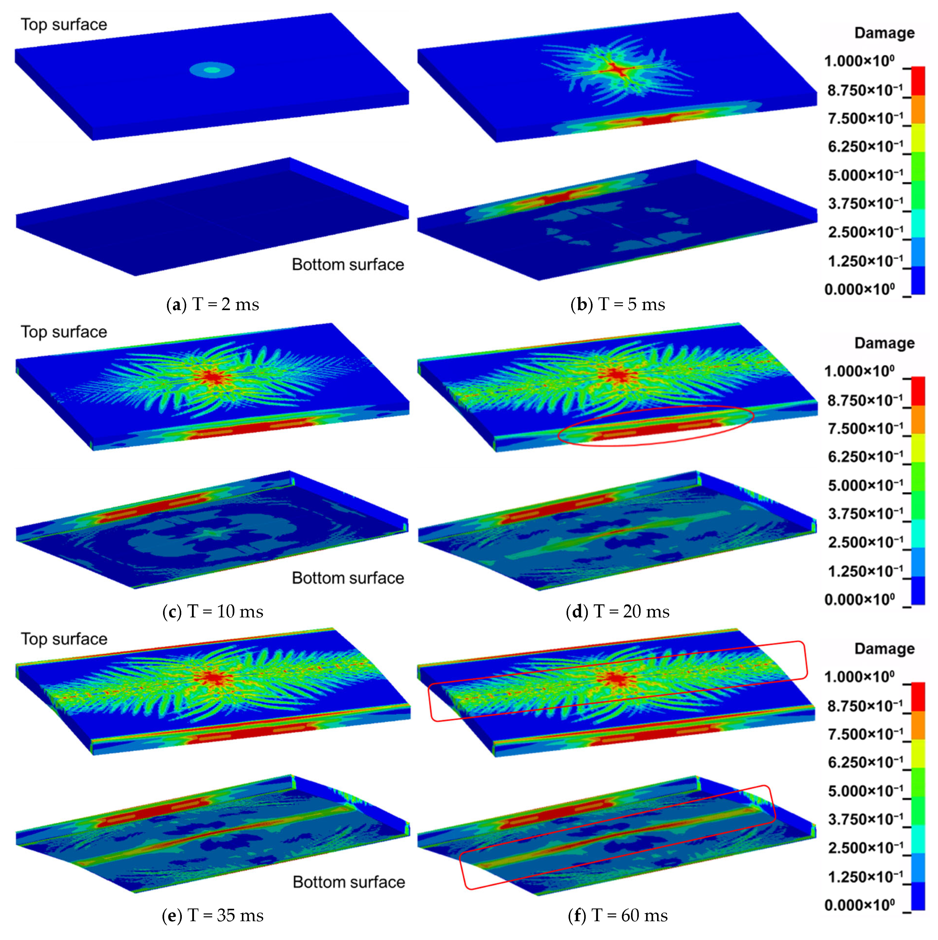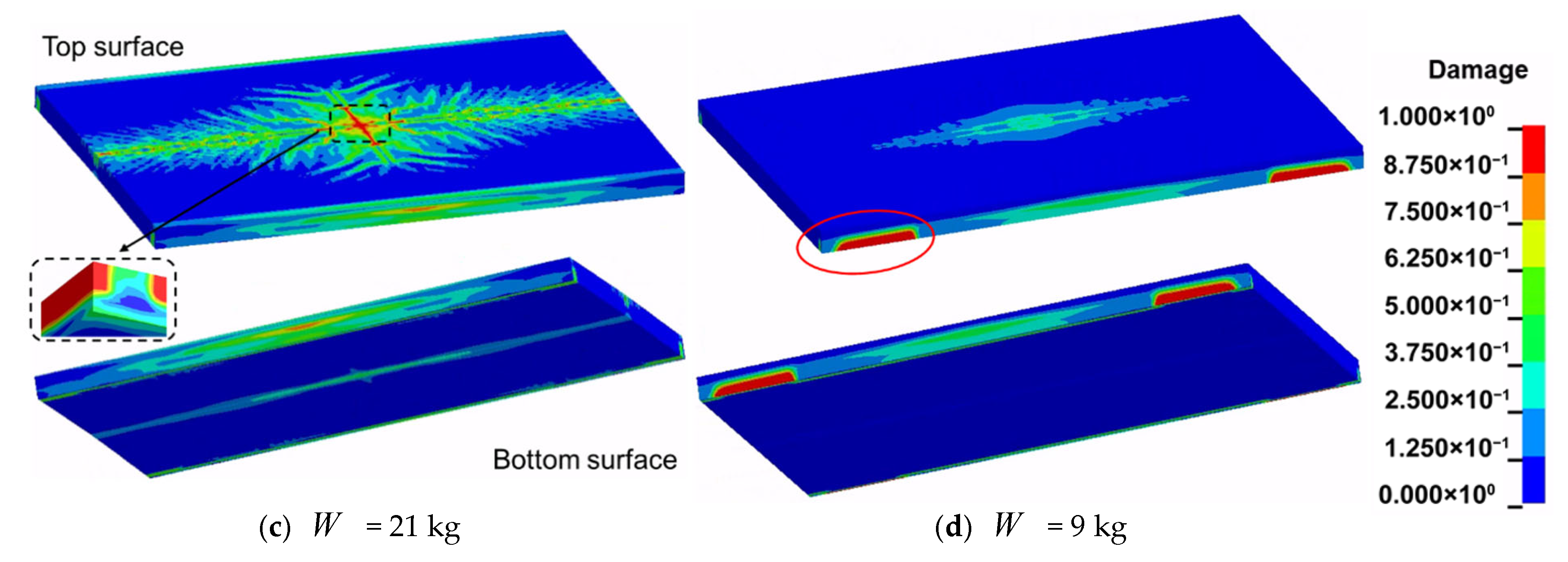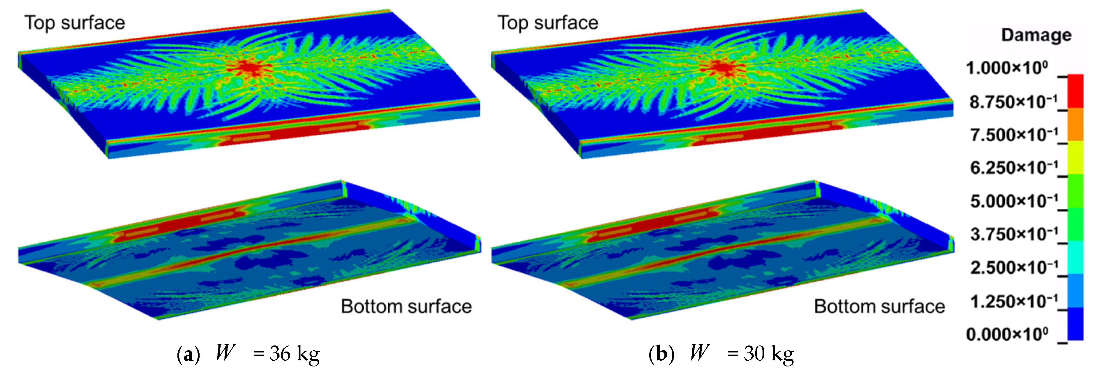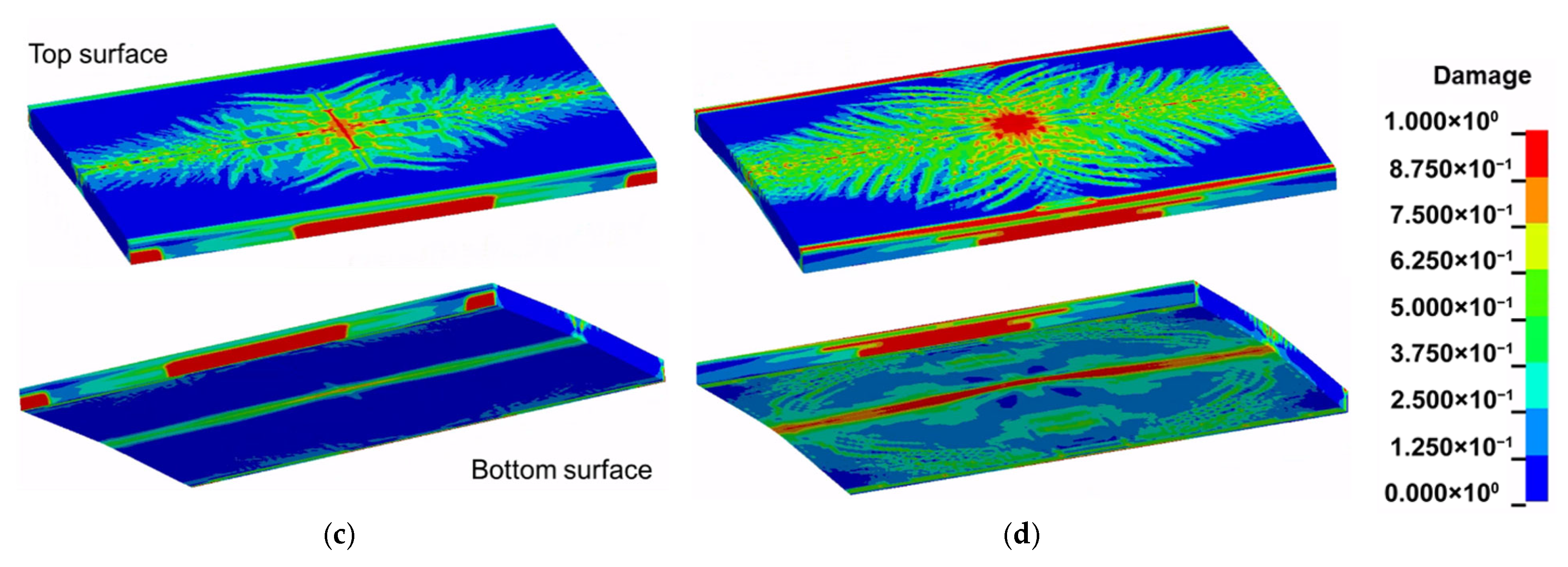 Figure 19 illustrates representative failure patterns corresponding to the four defined damage levels. At the slight damage level (Figure 19a), only small-scale cracking develops on the top surface, accompanied by localized tensile damage near the longitudinal ends of the side faces. The bottom surface remains essentially intact, and the overall stiffness and load-carrying capacity of the slab are largely preserved. At the moderate damage level (Figure 19b), the damaged area on the top surface expands, forming a distinct longitudinal band above the detonation region. Damage at mid-span along the side faces becomes more pronounced, and initial cracking appears on the bottom surface, with the longitudinal band remaining the dominant damage feature. At the severe damage level (Figure 19c), the affected zones on both the top and bottom surfaces enlarge significantly, and damage at mid-span intensifies substantially. The longitudinal damage bands on the upper and lower surfaces connect through the thickness, indicating a marked reduction in flexural stiffness. Concurrently, the damaged region at mid-span along the side faces broadens, whereas damage near the longitudinal ends diminishes. At the collapse level (Figure 19d), the top surface exhibits extensive cracking and spalling. The longitudinal bands on the top and bottom surfaces become fully connected over a large portion of the span. Severe damage concentrates at mid-span on the top surface and along the longitudinal band on the bottom surface. Adjacent areas show intensified cracking, and localized through-thickness failure zones develop near the side faces.