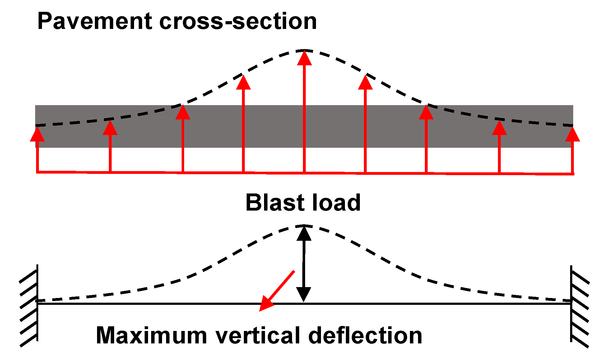 - Luccioni, B.M.; Luege, M. Concrete pavement slab under blast loads. Int. J. Impact Eng. 2006, 32, 1248–1266. [Google Scholar] [CrossRef]