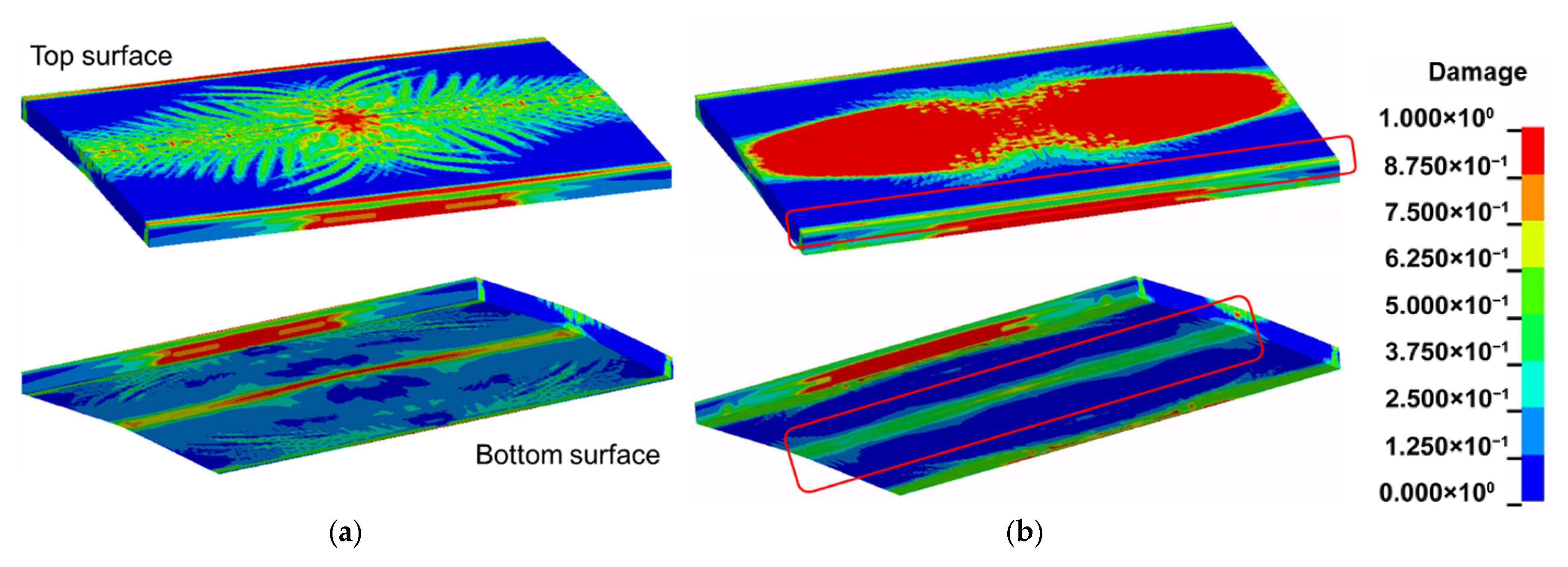 Figure 23 compares the damage patterns of the pavement structure before and after the application of the optimal CFRP reinforcement. The reinforced slab exhibits significantly increased overall stiffness, reduced crack widths, and a more favorable distribution of flexural deformation. In particular, the extent and severity of damage within the longitudinal damage zone at the bottom surface are markedly reduced, as shown in Figure 23b, indicating an effective suppression of tensile cracking on the tension side. At the same time, the reinforcement leads to a redistribution of internal forces and may promote slightly more pronounced cracking on the top surface, where compressive stresses and reflected tensile waves interact. Overall, the CFRP reinforcement scheme considered in this study effectively mitigates the blast-induced deformation and damage of the pavement structure and provides a rational basis for the design of practical strengthening measures for pavements above buried gas pipelines.