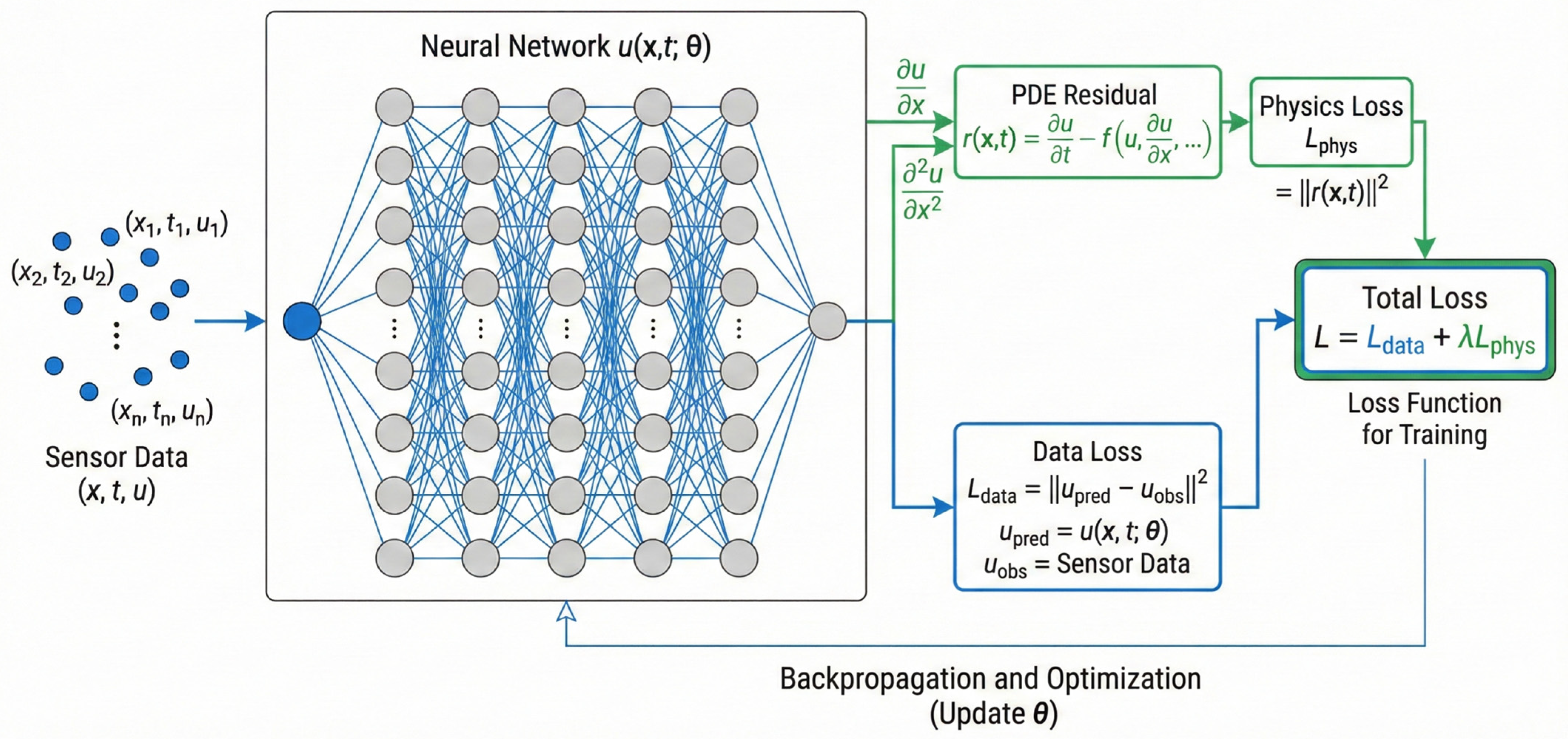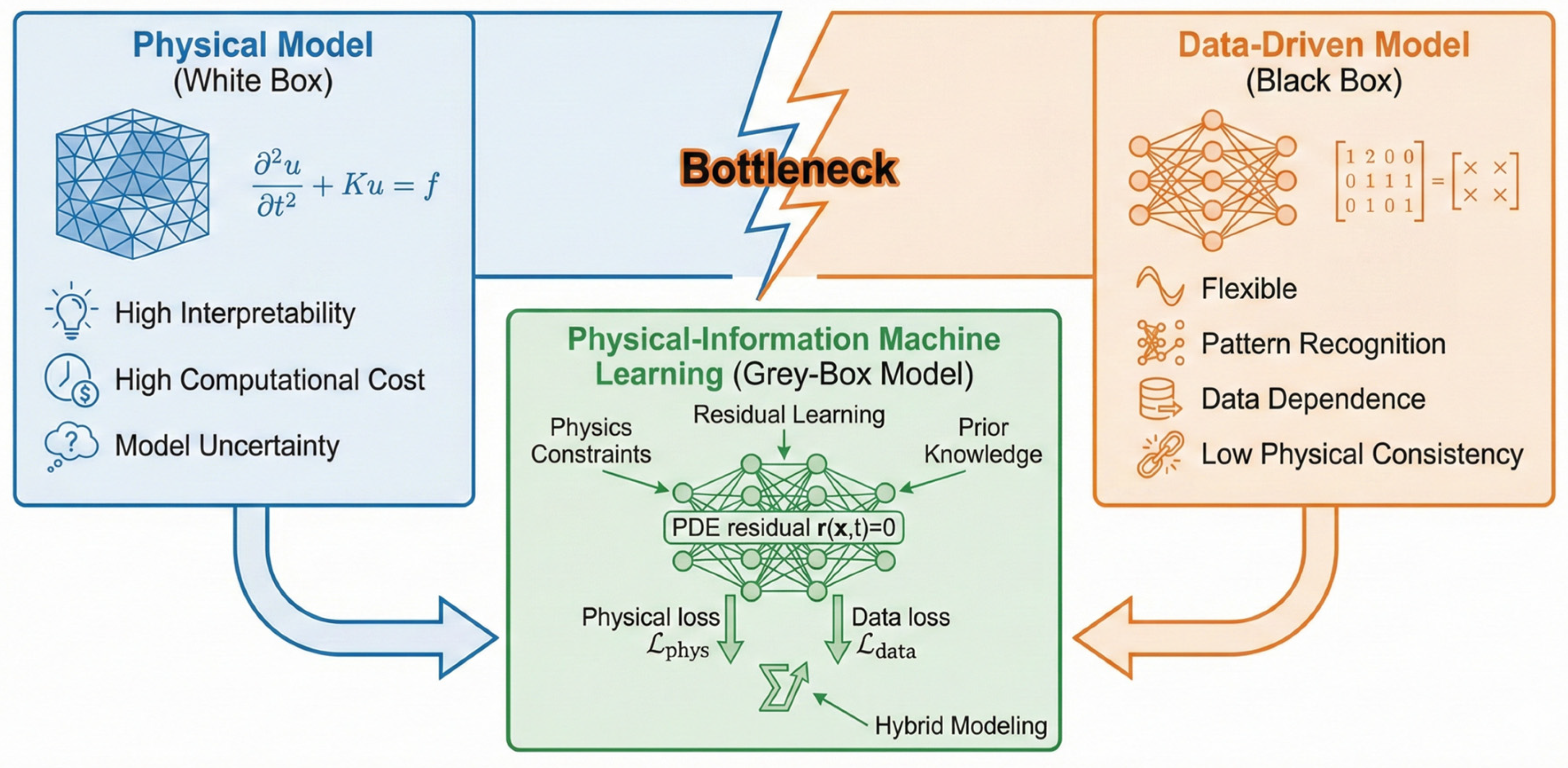 - Data assimilation and model updating: PIML can continuously fuse real-time sensor data with physical laws, dynamically adjust model parameters (such as stiffness and boundary conditions), and keep the digital twin and physical entity evolving synchronously, rather than a static “snapshot”.