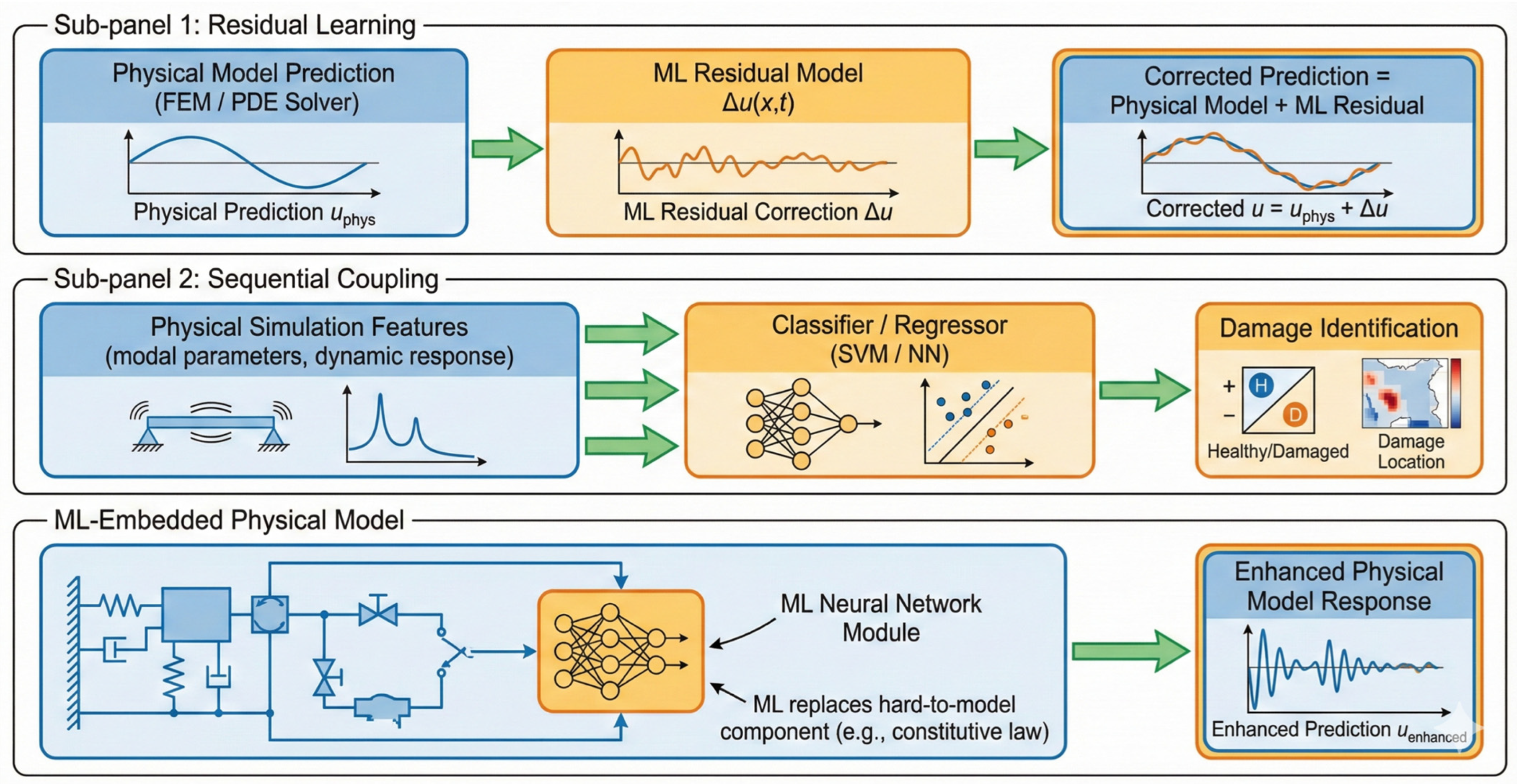 - Residual learning: ML models learn the differences between physical model predictions and measured data. For example, Wan et al. [34] use Gaussian process models to learn the residuals of finite element model modal prediction, thereby achieving efficient model updates and damage identification.