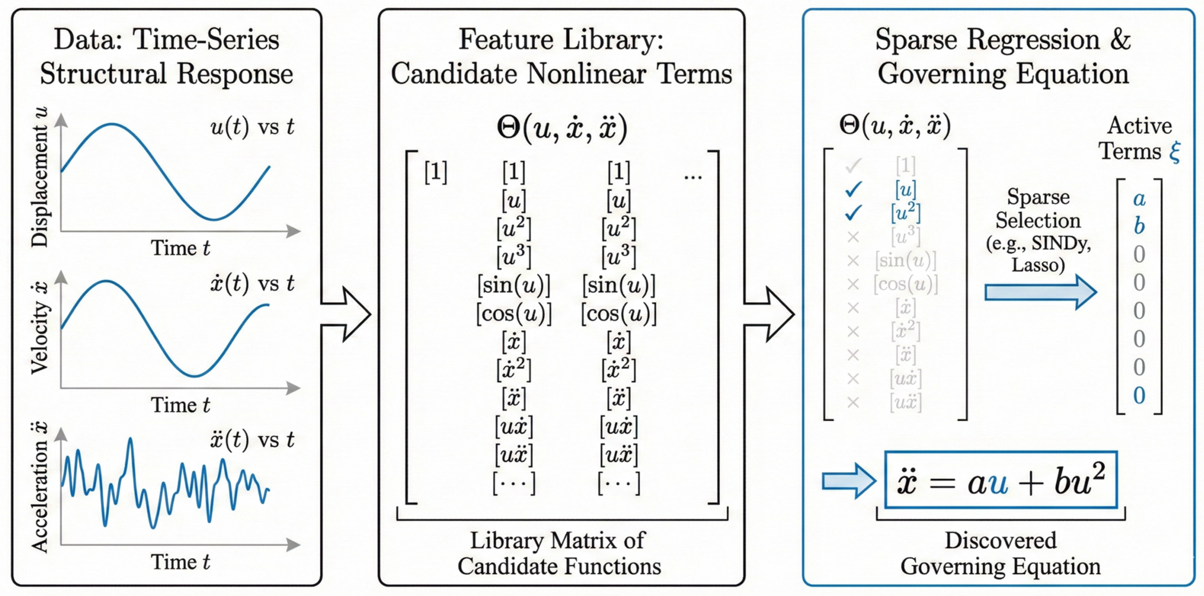- Mechanism: Using techniques such as sparse regression [37] or symbolic regression [38], the simplest combination of mathematical terms that best describes the dynamics of observed data is automatically selected from a large candidate function library (such as polynomials, trigonometric functions, etc.), resulting in an explicit control equation (Figure 5).
