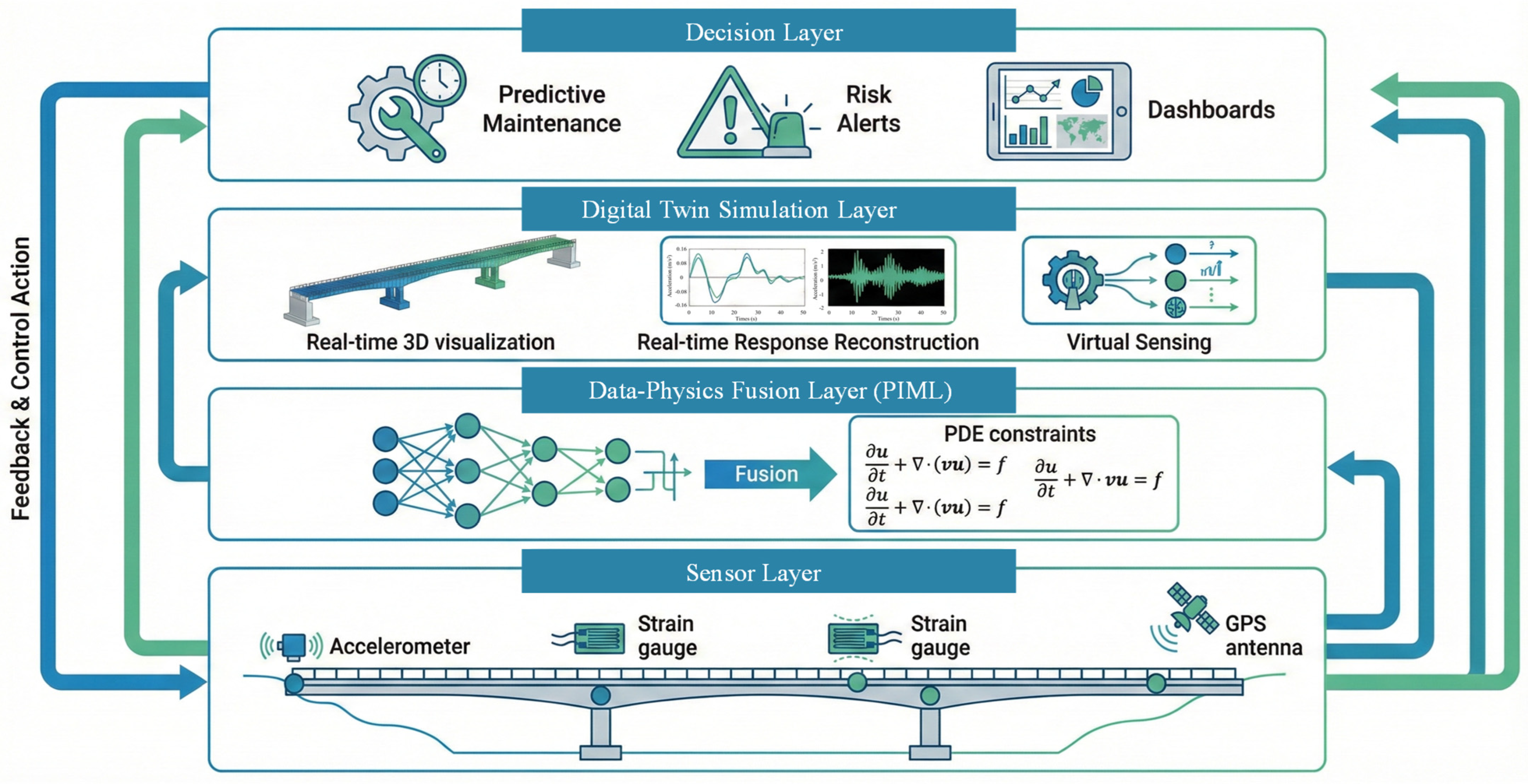 - Mechanism: The digital twin continuously learns the degradation laws of the structure (such as material performance degradation) through PIML and can simulate the structural behavior under future load scenarios (such as traffic growth, extreme storms), thereby predicting its remaining service life and failure risk.