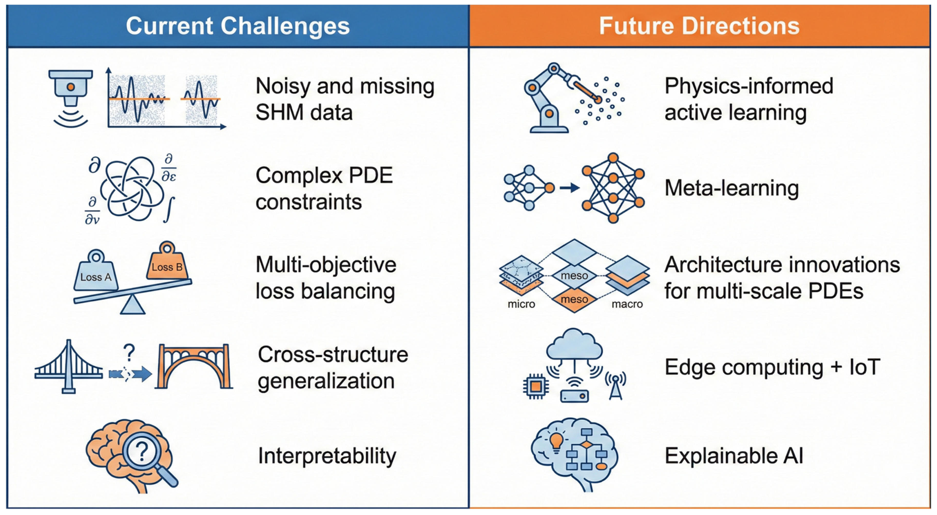 - Self-supervision and meta learning: As shown in ref. [61], using physical laws to create pre-training tasks from unlabeled data, or training meta-models that can quickly adapt to new bridges, will be the key to solving small-sample and cross-structure generalization problems.