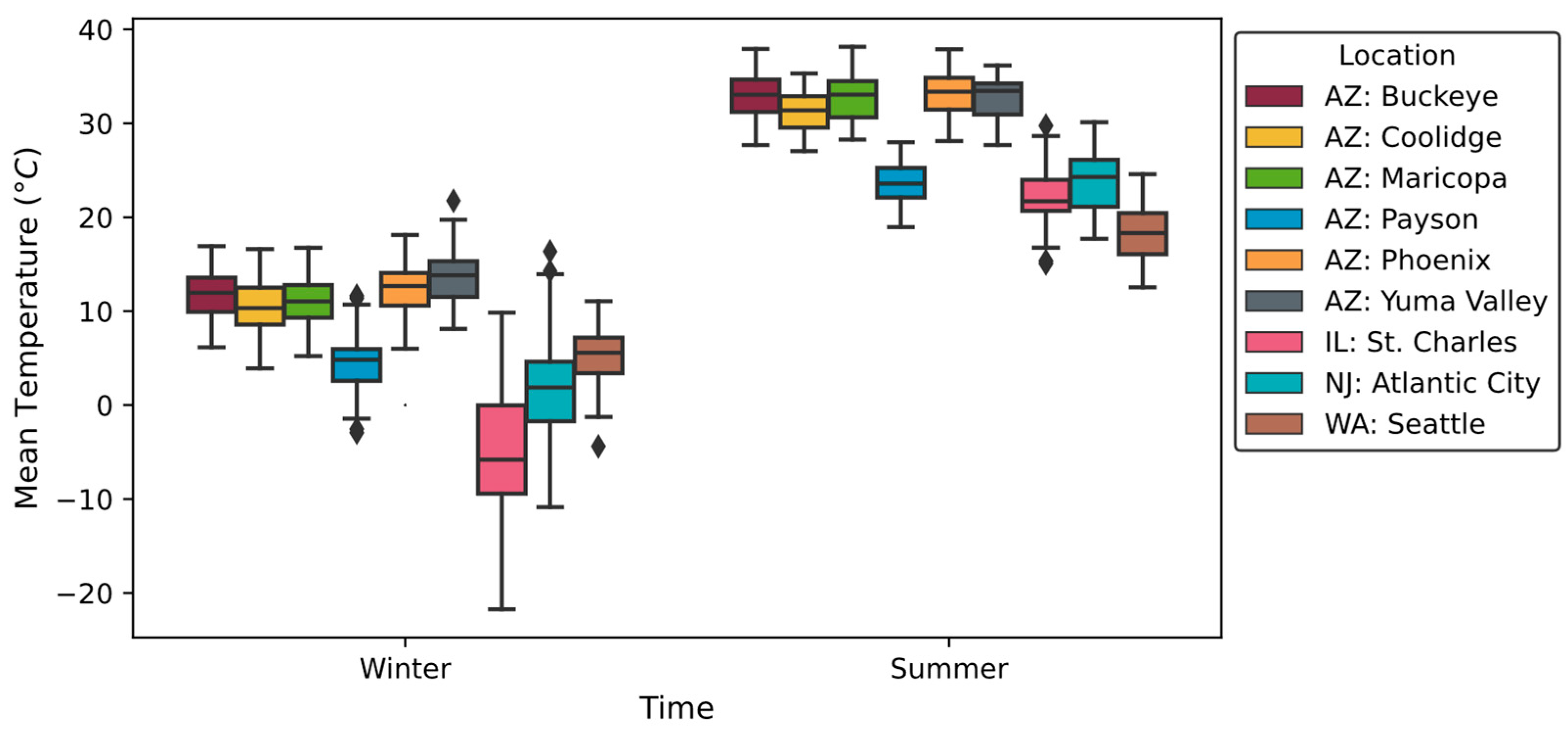 - The study area experiences a significantly higher diurnal temperature range and a faster cooling rate compared to other regions, reflected also into the temperature distributions in the pavement structures.