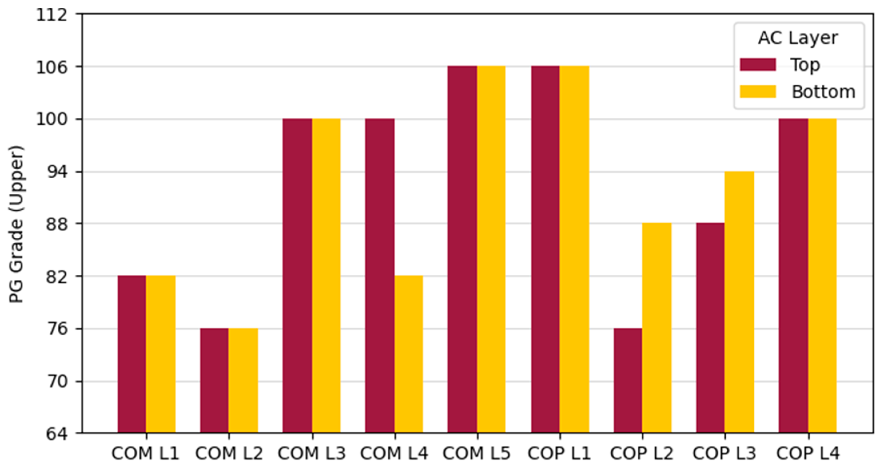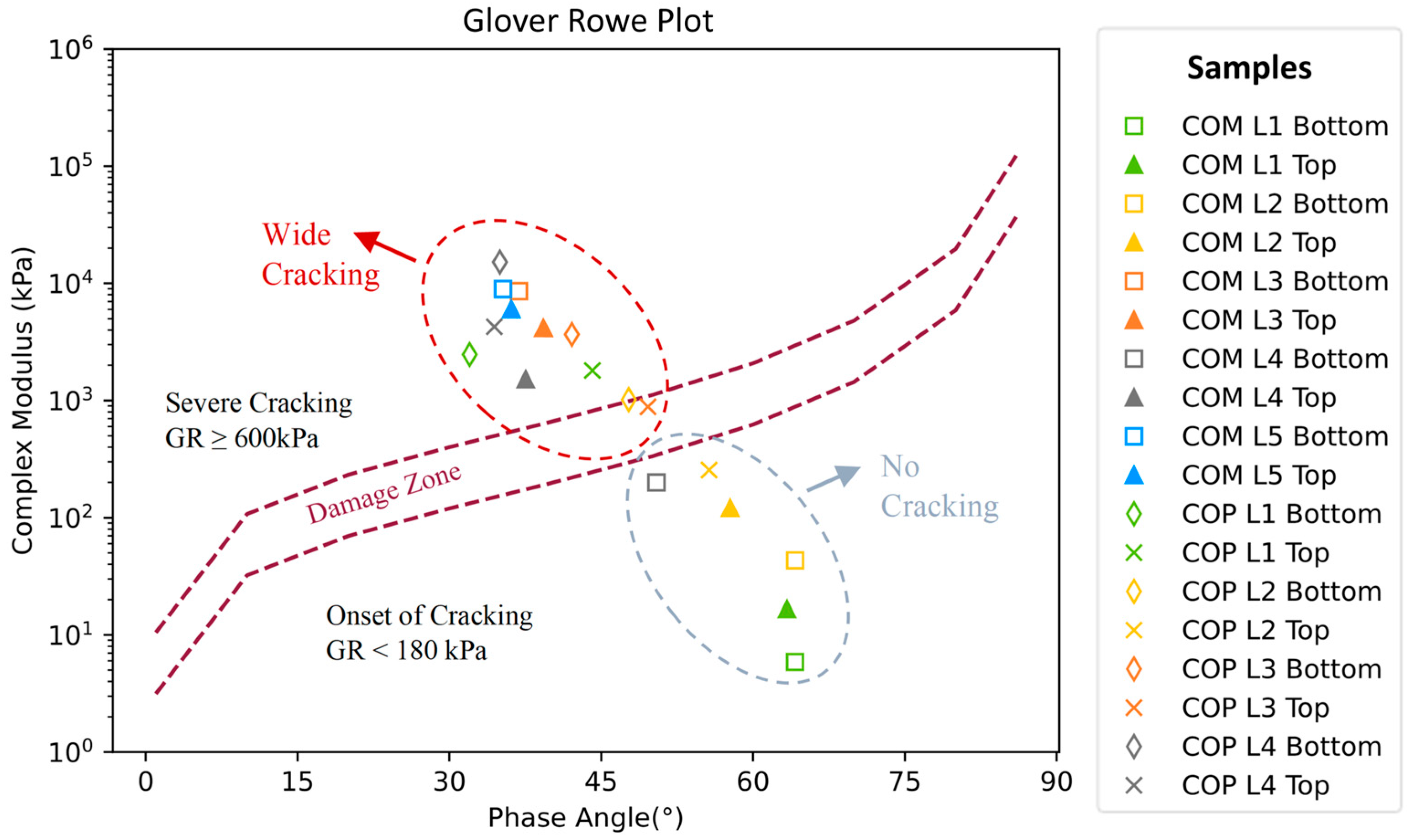 - All evaluated wide-cracking sections exhibited severely aged and embrittled unmodified binders, as indicated by elevated complex shear modulus values, increased equivalent PG grades, and reduced fracture resistance.