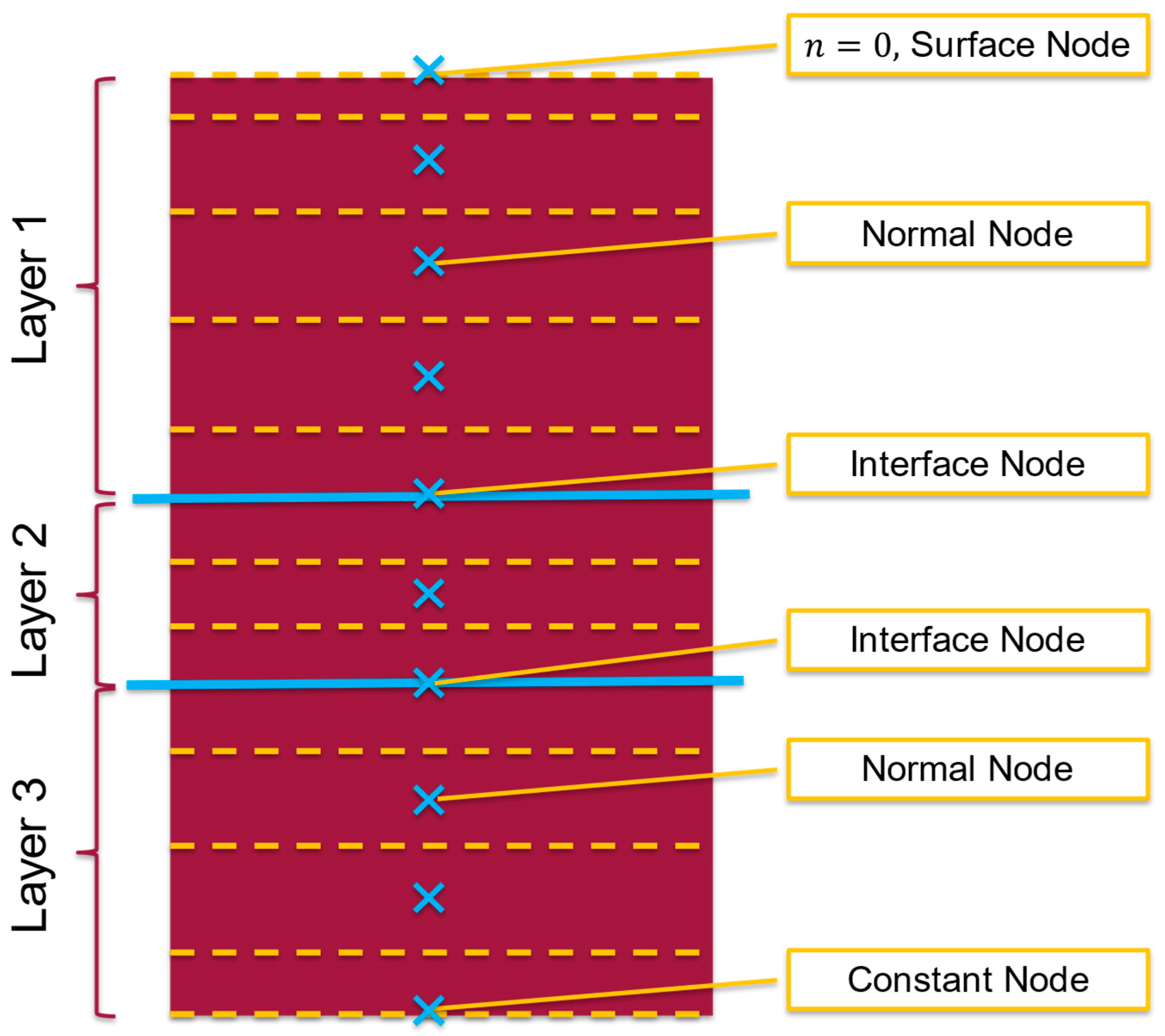 | Layer | E (MPa) | CTE (μϵ/°C) | SHC (J/kg.K) | TC (W/m.K) | Element Edge Size (mm) |