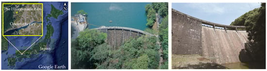 As shown in Figure 1, the Hisayamada Dam is a water supply dam located in Onomichi City, Hiroshima Prefecture, western Japan. The dam is an arch-shaped gravity concrete dam with a rough-stone masonry facing, in which mortar is filled between stones and the surface is covered with stone cladding. The dam was constructed in 1924 to address chronic water shortages caused by population growth in Onomichi City. The catchment area is 3.6 km2, and the total storage capacity is 720,000 m3. A semicircular intake tower is installed on the right bank of the dam body, while a free-overflow spillway without gates is located on the left bank side of the intake tower.