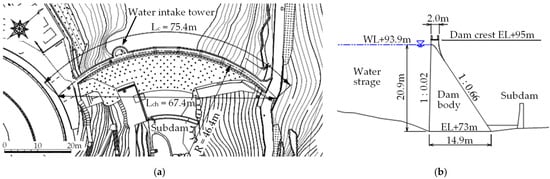 Geometry of the Hisayamada Dam: (a) plan view; (b) longitudinal cross-section.