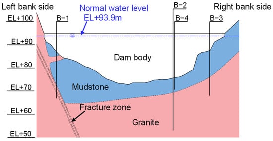 Figure 3 shows the geological cross section along the dam axis. At the base of the dam, mudstone with an uniaxial compressive strength of approximately 34 MPa is distributed. This rock has been thermally metamorphosed by the intrusion of granite, forming hard, massive hornfels. It contains a network of cracks, but these are tightly closed, without any particular orientation or continuity, and thus exhibit low permeability. Below an elevation of about 70 m, hard granite is present beneath the mudstone, having an uniaxial compressive strength of approximately 235 MPa.