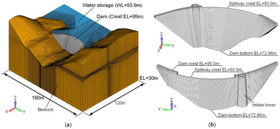 Figure 4 shows the three-dimensional FEM analysis model, which integrates the dam body, surrounding terrain, and reservoir. The dam body and foundation rock were modeled as solid elements using three-dimensional isoparametric elements with eight or six nodes, and joint elements were installed at the contact surface between the dam body and the foundation rock. The joint elements connect the nodes of the dam and foundation rock solid elements by springs in the shear and vertical directions. In general, joint elements allow sliding and separation at the interface according to shear and tensile failure criteria; however, in this study, shear and tensile failures were not considered. Therefore, the joint elements were introduced solely to evaluate the vertical and shear stresses acting at the dam–foundation interface.