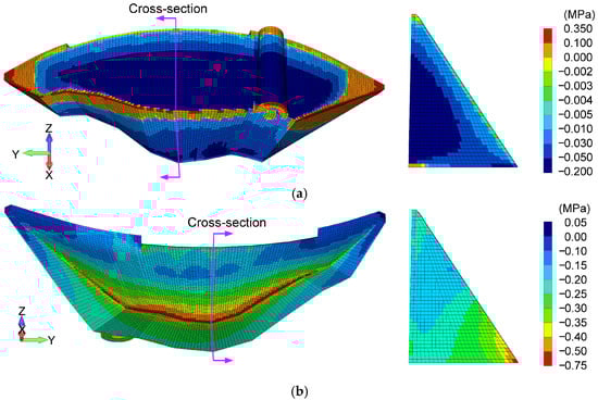 Maximum stress distribution under normal conditions: (a) maximum tensile stress; (b) maximum compressive stress.