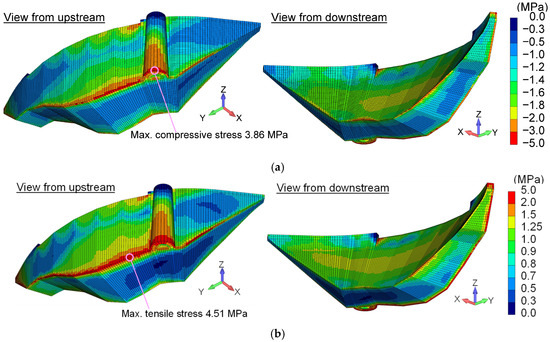 Distribution of maximum tensile stress and maximum compressive stress in the dam body due to the Aki-nada earthquake for the dam body stiffness reduction case: (a) maximum tensile stress; (b) maximum compressive stress. The tensile stress is displayed as positive.