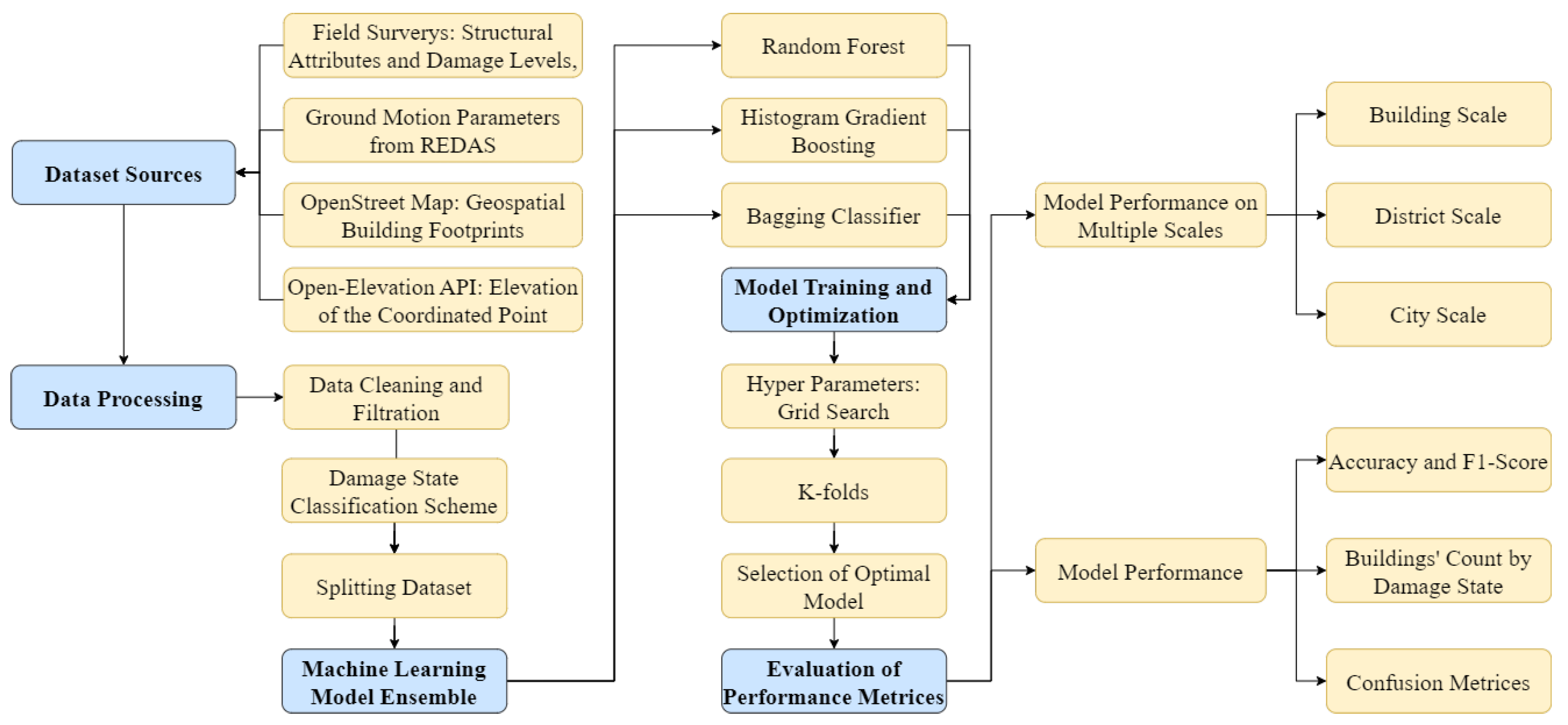 This section outlines the methodological framework adopted for developing and evaluating the machine learning models used in this study. A systematic workflow was implemented, encompassing data preprocessing, model training, and performance evaluation. Each step was designed to ensure the reliability, generalizability, and robustness of the predictive models for post-earthquake damage estimation. The machine learning algorithms were implemented using Python 3.10 Version and the scikit-learn library.