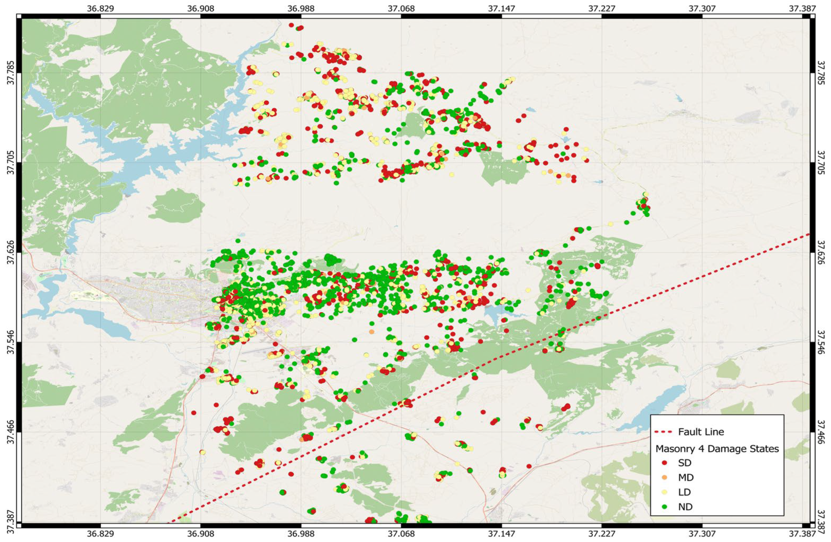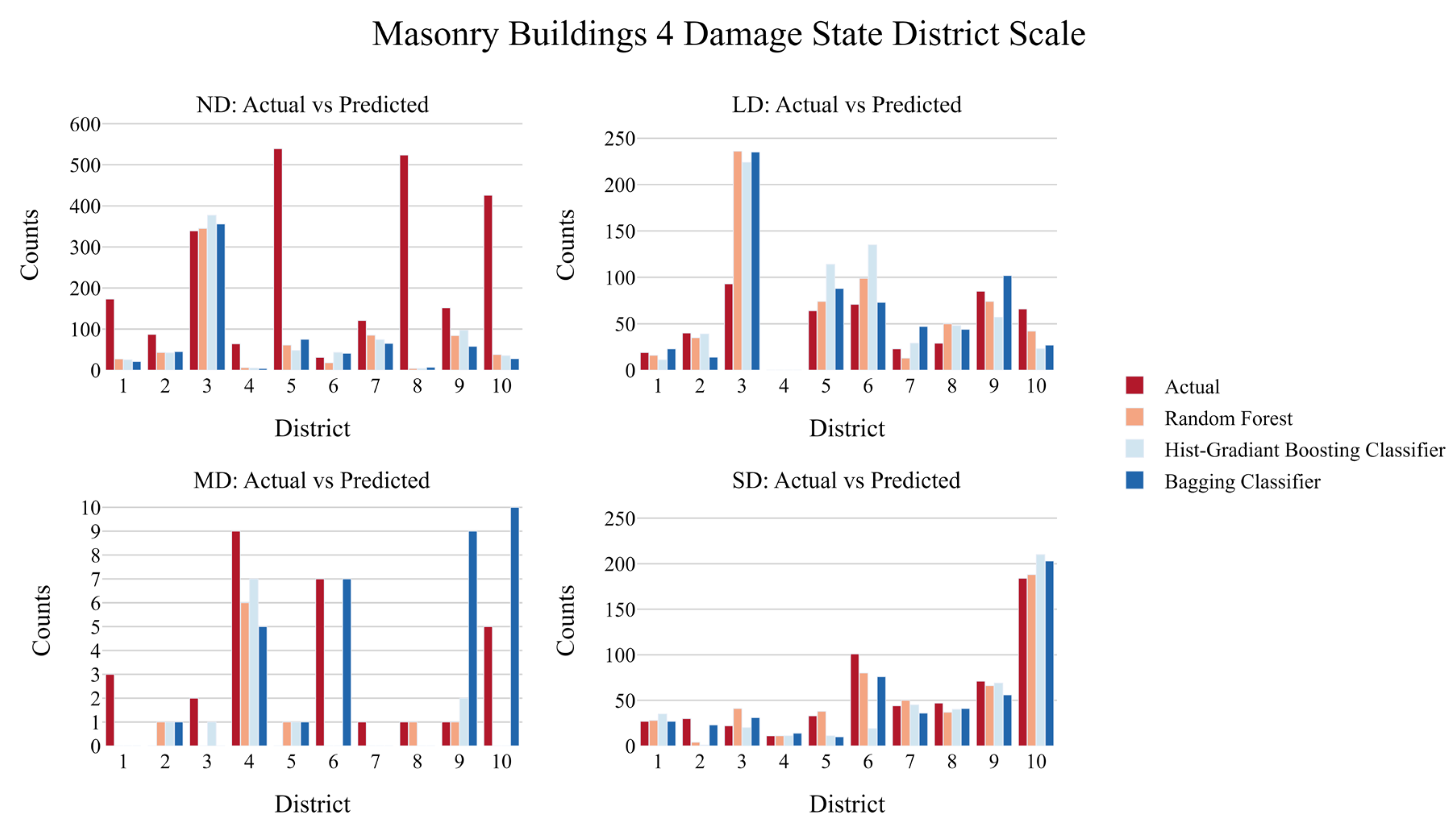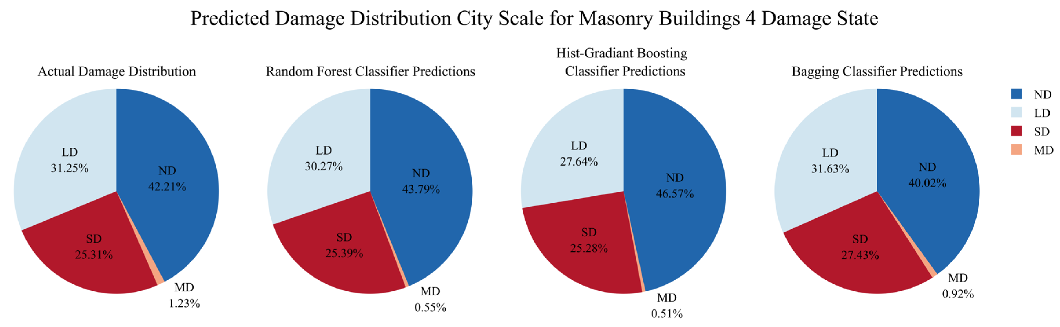 Masonry buildings four Damage Classes: The city-scale prediction for masonry buildings across four damage categories showed a high level of consistency with the actual damage data (