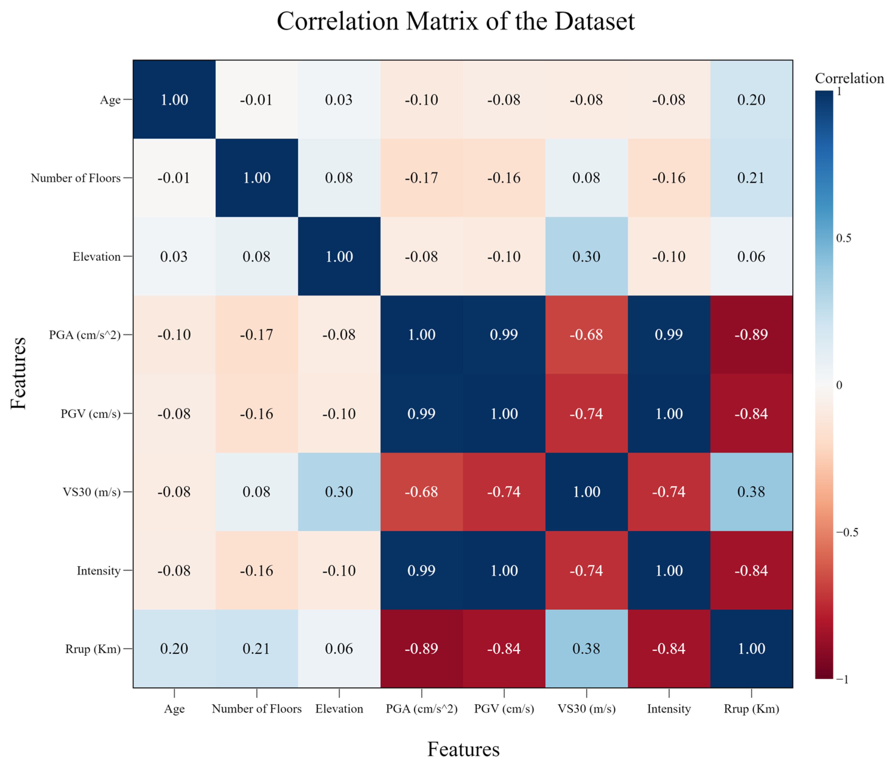 Figure 5 shows the correlation heat map of the input features used in the analysis. Structural variables such as building age, number of floors, and elevation exhibit weak correlations with seismic intensity measures, indicating limited redundancy among these parameters. In contrast, strong correlations are observed between PGA, PGV, and macro seismic intensity, which is consistent with their physical interdependence. VS30 demonstrates a negative correlation with ground motion parameters, highlighting the influence of site conditions on seismic response. Overall, the observed correlations are physically reasonable and support the suitability of the selected features for damage prediction.