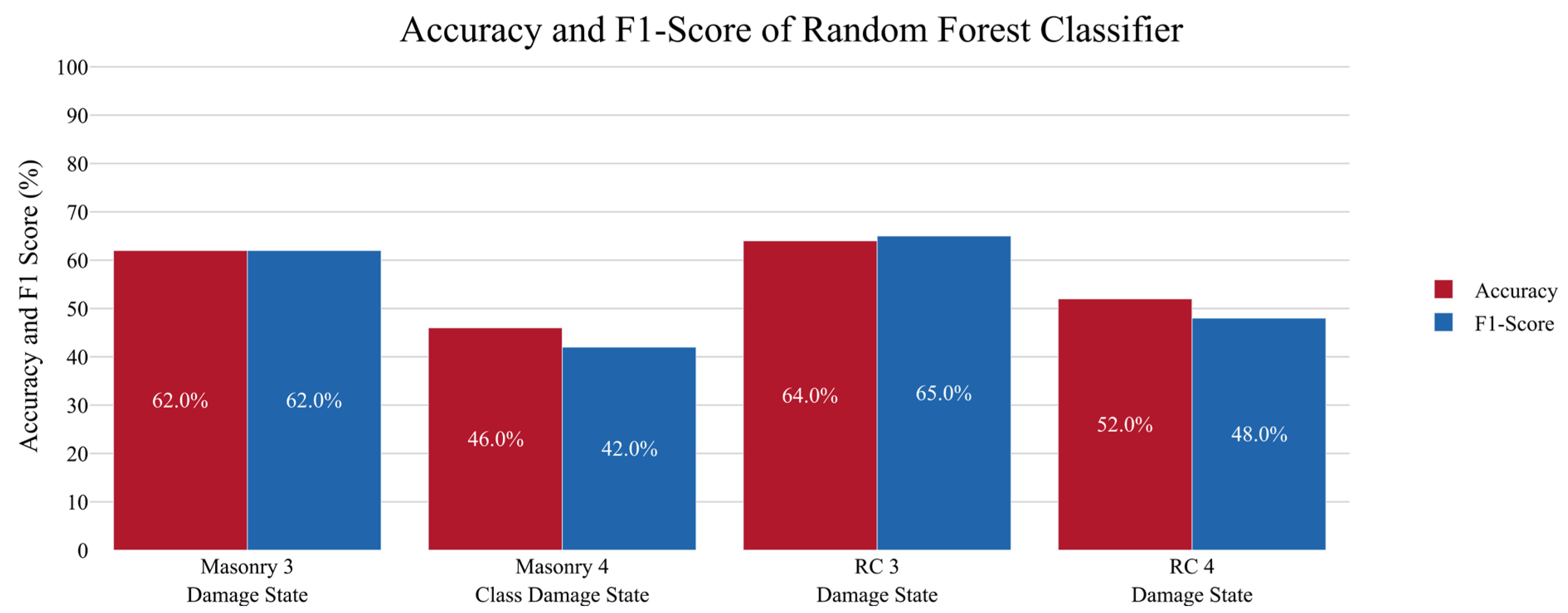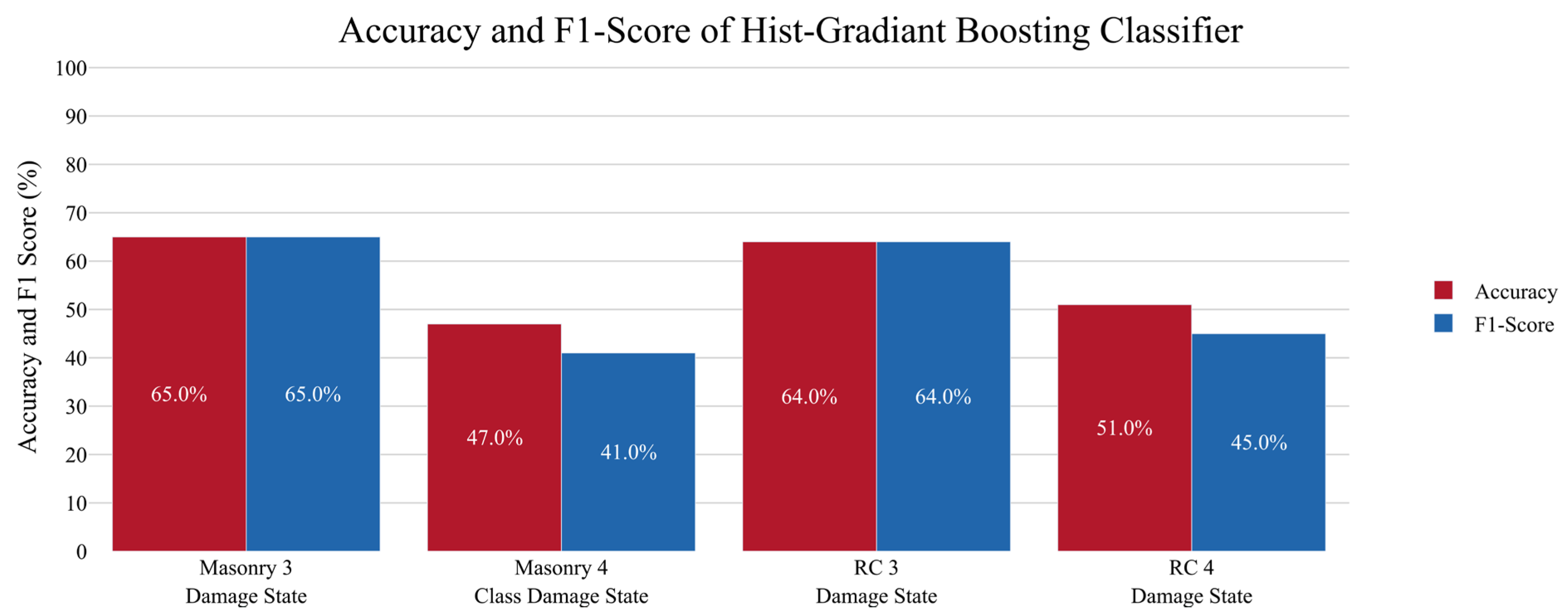 In the three-damage state classification, a moderate decline in performance was observed, with both accuracy and F1-scores averaging around 63% across all algorithms. For the four-damage state classification, a further reduction in predictive accuracy was noted. In the case of masonry buildings, the models achieved accuracies of approximately 46% with corresponding F1-scores of 42%. For reinforced concrete buildings, the accuracy exceeded 51%, with an average F1-score of around 48% as shown in