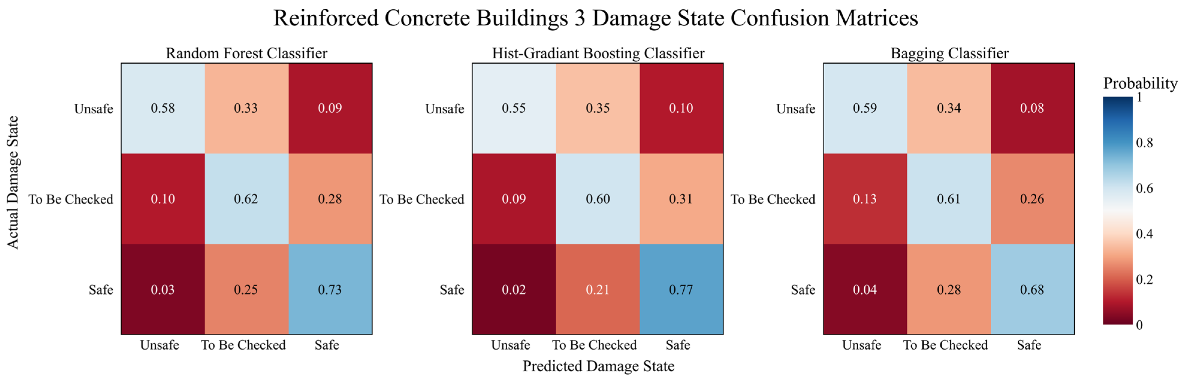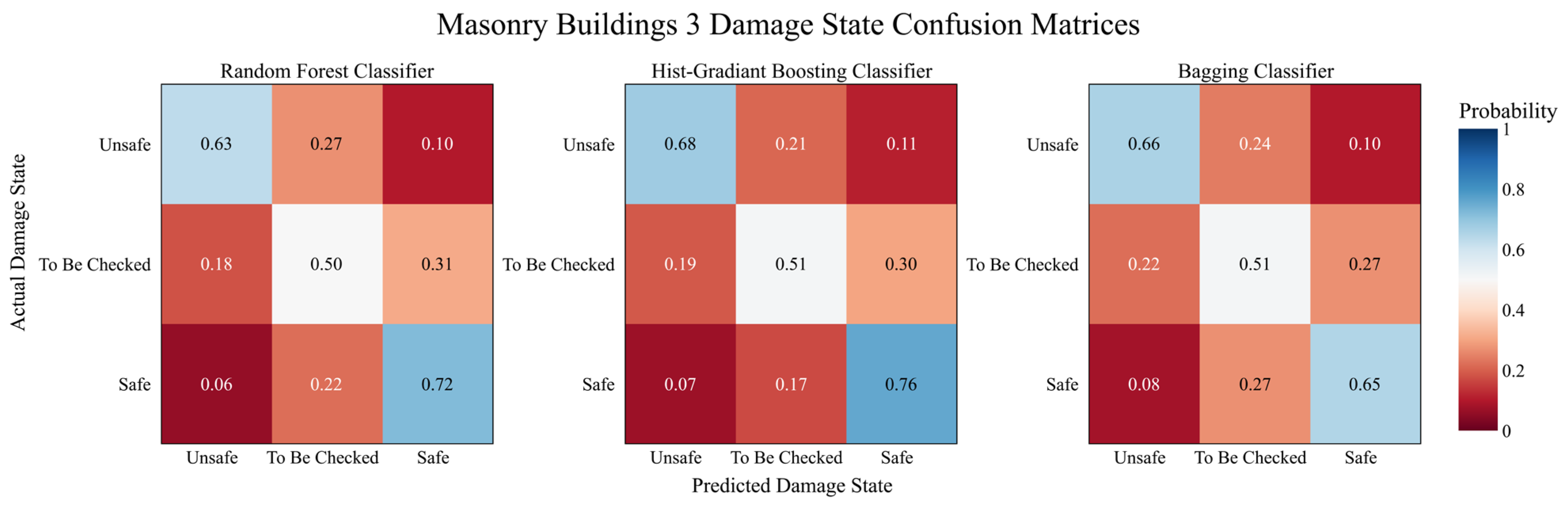 Figure 9) shows that misclassification of “Unsafe” buildings as “Safe” was limited to around 10%, while approximately 30% were incorrectly categorized as requiring “Further Assessment.” The “Safe” class was accurately predicted in over 75% of cases, particularly when using the Histogram-Based Gradient Boosting classifier.